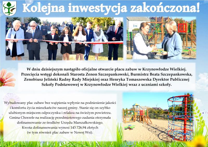 W dniu dzisiejszym nastąpiło oficjalne otwarcie placu zabaw w Krzynowłodze Wielkiej. Przecięcia wstęgi dokonali Starosta Zenon Szczepankowski, Burmistrz Beata Szczepankowska, Zenobiusz Jeliński Radny Rady Miejskiej oraz Henryka Tomaszewska Dyrektor Publicznej Szkoły Podstawowej w Krzynowłodze Wielkiej wraz z uczniami szkoły.