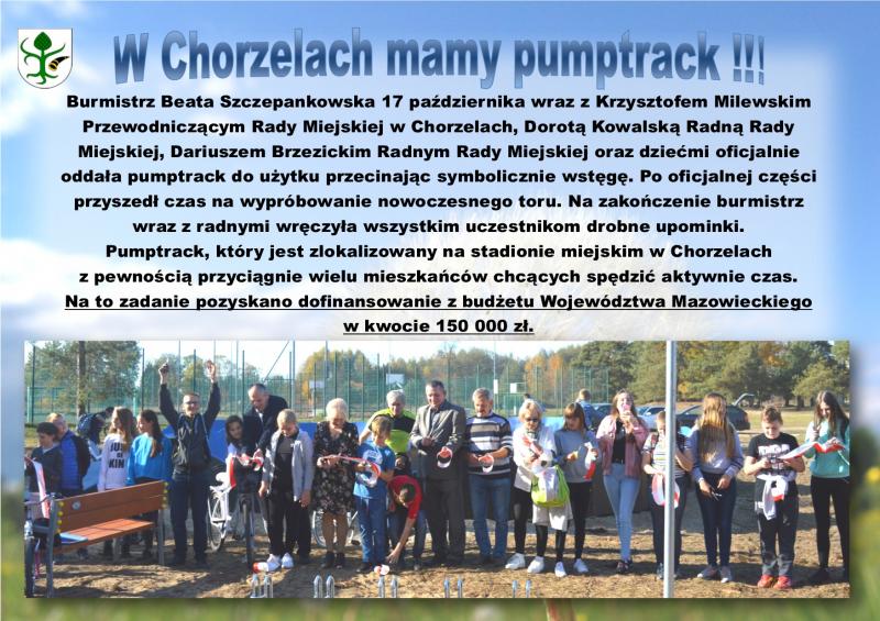 Burmistrz Beata Szczepankowska 17 października wraz z Krzysztofem Milewskim Przewodniczącym Rady Miejskiej w Chorzelach, Dorotą Kowalską Radną Rady Miejskiej, Dariuszem Brzezickim Radnym Rady Miejskiej oraz dziećmi oficjalnie oddała pumptrack do użytku przecinając symboliczną wstęgę. Po oficjalnej części przyszedł czas na wypróbowanie nowoczesnego toru.