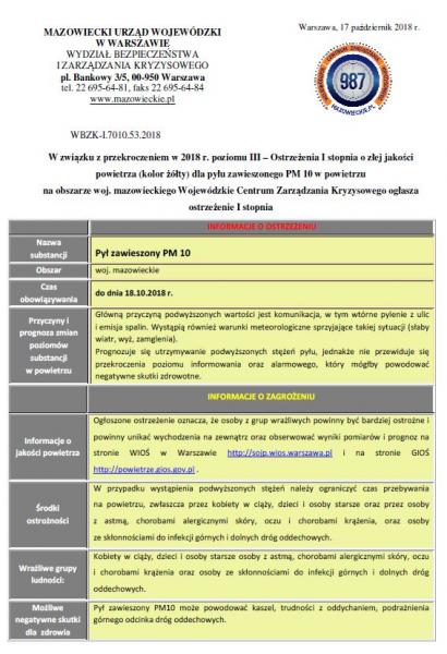 W związku z przekroczeniem w 2018 r. poziomu III – Ostrzeżenia I stopnia o złej jakości powietrza (kolor żółty) dla pyłu zawieszonego PM 10 w powietrzu na obszarze woj. mazowieckiego Wojewódzkie Centrum Zarządzania Kryzysowego ogłasza ostrzeżenie I stopnia.