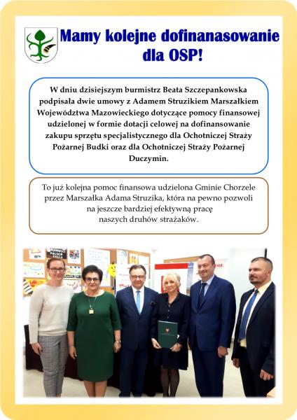W dniu dzisiejszym burmistrz Beata Szczepankowska podpisała dwie umowy z Adamem Struzikiem Marszałkiem Województwa  Mazowieckiego dotyczące pomocy finansowej udzielonej w formie dotacji celowej na dofinansowanie zakupu sprzętu specjalistycznego dla Ochotniczej Straży Pożarnej Budki oraz dla Ochotniczej Straży Pożarnej Duczymin.