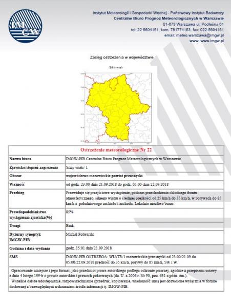 Obrazek Ostrzeżenie meteorologiczne Nr 22  IMGW-PIB Centralnego Biura Prognoz Meteorologicznych w Warszawie więcej