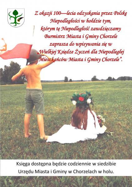 Z okazji 100-lecia odzyskania przez Polskę Niepodległości w hołdzie tym, którym tę Niepodległość zawdzięczamy Burmistrz MIasta i Gminy Chorzele zaprasza do wpisywania się w "Wielkiej Księdze Życzeń dla Niepodległej Mieszkańców Miasta i Gminy Chorzele".