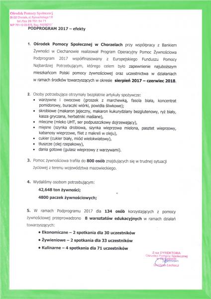Ośrodek Pomocy Społecznej w Chorzelach przy współpracy z Bankiem Żywności w Ciechanowie realizował Program Operacyjny Pomoc Żywnościowa Podprogram 2017 współfinansowany z Europejskiego Funduszu Pomocy Najbardziej Potrzebującym, którego celem było zapewnienie najuboższym mieszkańcom Polski pomocy żywnościowej oraz uczestnictwa w działaniach w ramach środków towarzyszących w okresie sierpień 2017 - czerwiec 2018.