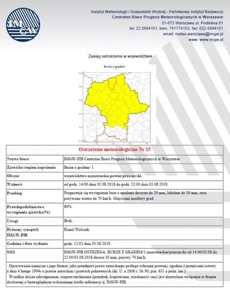 Obrazek Ostrzeżenie meteorologiczne nr 15 IMGW-PIB Centralnego Biura Prognoz Meteorologicznych w Warszawie. więcej