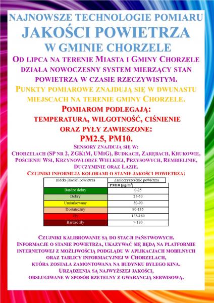 Obrazek Od lipca na terenie mlasta i gminy chorzele działa nowoczesny system mierzący stan powietrza w czasie rzeczywistym. Punkty pomiarowe znajdują się w dwunastu miejscach na terenie gminy chorzele.