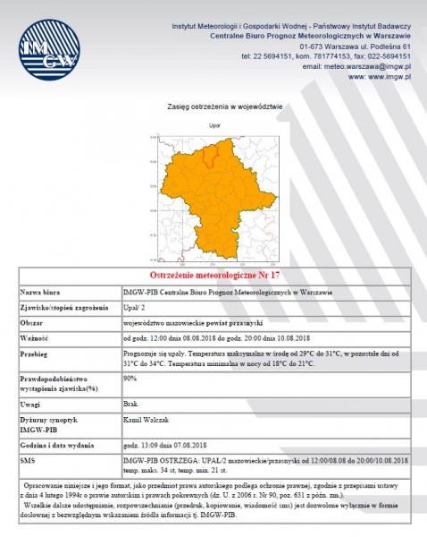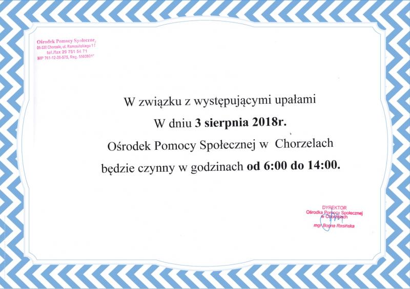 W związku z występującymi upałami w dniu 3 sierpnia 2018r. Ośrodek Pomocy Społecznej w Chorzelach będzie czynny w godzinach od 6:00 do 14:00.