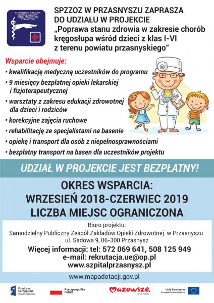 Serdecznie zapraszamy do udziału w projekcie „Poprawa stanu zdrowia w zakresie chorób kręgosłupa wśród dzieci z klas I-VI z terenu powiatu przasnyskiego” współfinansowanego ze środków Europejskiego Funduszu Społecznego w ramach RPO WM 2014-2020. Realizatorem projektu jest Samodzielny Publiczny Zespół Zakładów Opieki Zdrowotnej w Przasnyszu.