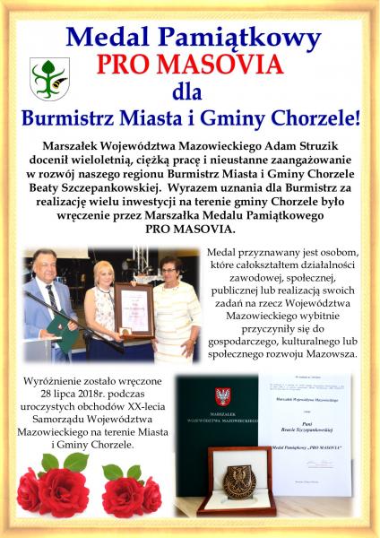 Marszałek Województwa Mazowieckiego Adam Struzik docenił wieloletnią, ciężką pracę i nieustanne zaangażowanie w rozwój naszego regionu Burmistrz Miasta i Gminy Chorzele Beaty Szczepankowskiej. Wyrazem uznania dla Burmistrz za realizację wielu inwestycji na terenie gminy Chorzele było wręczenie przez Marszałka Medalu Pamiątkowego PRO MASOVIA.