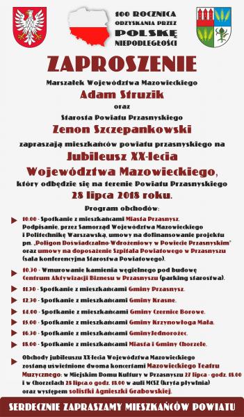 Marszałek Województwa Mazowieckiego - Adam Struzik oraz Starosta Powiatu Przasnyskiego - Zenon Szczepankowski zapraszają mieszkańców powiatu przasnyskiego na Jubileusz XX-lecia Województwa Mazowieckiego, który odbędzie się na terenie Powiatu Przasnyskiego 28 lipca 2018r.