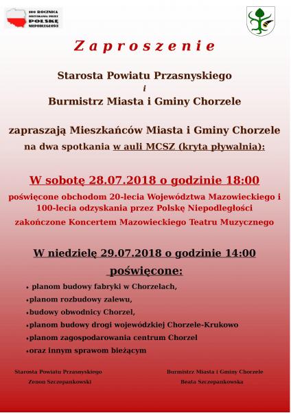 Starosta Powiatu Przasnyskiego i Burmistrz Miasta i Gminy Chorzele serdecznie zapraszają Mieszkańców Miasta i Gminy Chorzele na dwa spotkania w auli MCZS (kryta pływalnia) w sobotę 28.07.2018r. o godz. 18:00 oraz w niedzielę 29.07.2018r. o godz. 14:00. Szczegóły znajdują się na plakacie. Serdecznie zapraszamy!