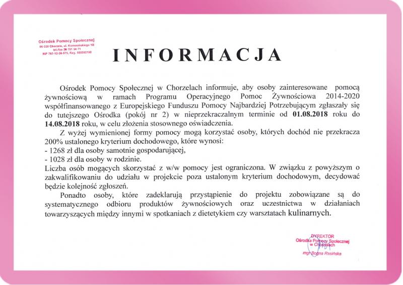 Ośrodek Pomocy Społecznej w Chorzelach informuje, aby osoby zainteresowane pomocą żywnościową w ramach Programu Operacyjnego Pomoc Żywnościowa 2014-2020 współfinansowanego z Europejskiego Funduszu Pomocy Najbardziej Potrzebującym zgłaszały się do tutejszego Ośrodka (pokój nr 2) w nieprzekraczalnym terminie od 01.08.2018 roku do 14.08.2018 roku, w celu złożenia stosownego oświadczenia.