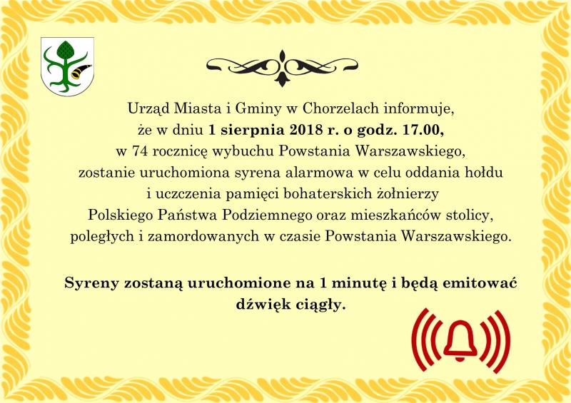 Urząd Miasta i Gminy w Chorzelach informuje, że w dniu 1 sierpnia 2018 r. o godz. 17.00, w 74 rocznicę wybuchu Powstania  Warszawskiego, zostanie uruchomiona syrena alarmowa w celu oddania hołdu i uczczenia pamięci bohaterskich żołnierzy Polskiego Państwa Podziemnego oraz mieszkańców stolicy, poległych i zamordowanych w czasie Powstania Warszawskiego.