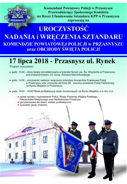 Komendant Powiatowy Policji w Przasnyszu, Przewodniczący Społecznego Komitetu na Rzecz Ufundowania Sztandaru KPP w Przasnyszu zapraszają na uroczystość nadania i wręczenia sztandaru Komendzie Powiatowej Policji w Przasnyszu oraz Obchody Święta Policji, które odbędą się 17 lipca 2018 na ul. Rynek w Przasnyszu.