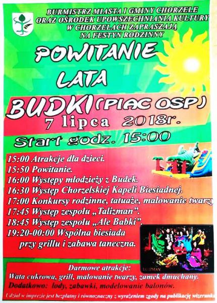 Burmistrz MIasta i Gminy Chorzele oraz Ośrodek Upowszechniania Kultury w Chorzelach zapraszają na festyn rodzinny POWITANIE LATA W BUDKACH, który odbędzie się 7 lipca 2018r. o godz. 15:00 na placu OSP w Budkach.