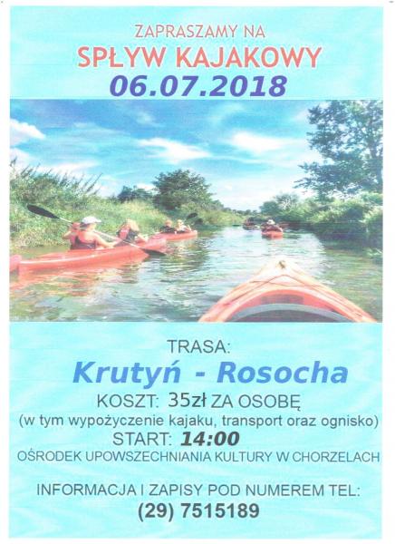 Serdecznie zapraszamy na spływ kajakowy, który odbędzie się 06.07.2018r. Start godz. 14:00 - Ośrodek Upowszechniania Kultury w Chorzelach.
