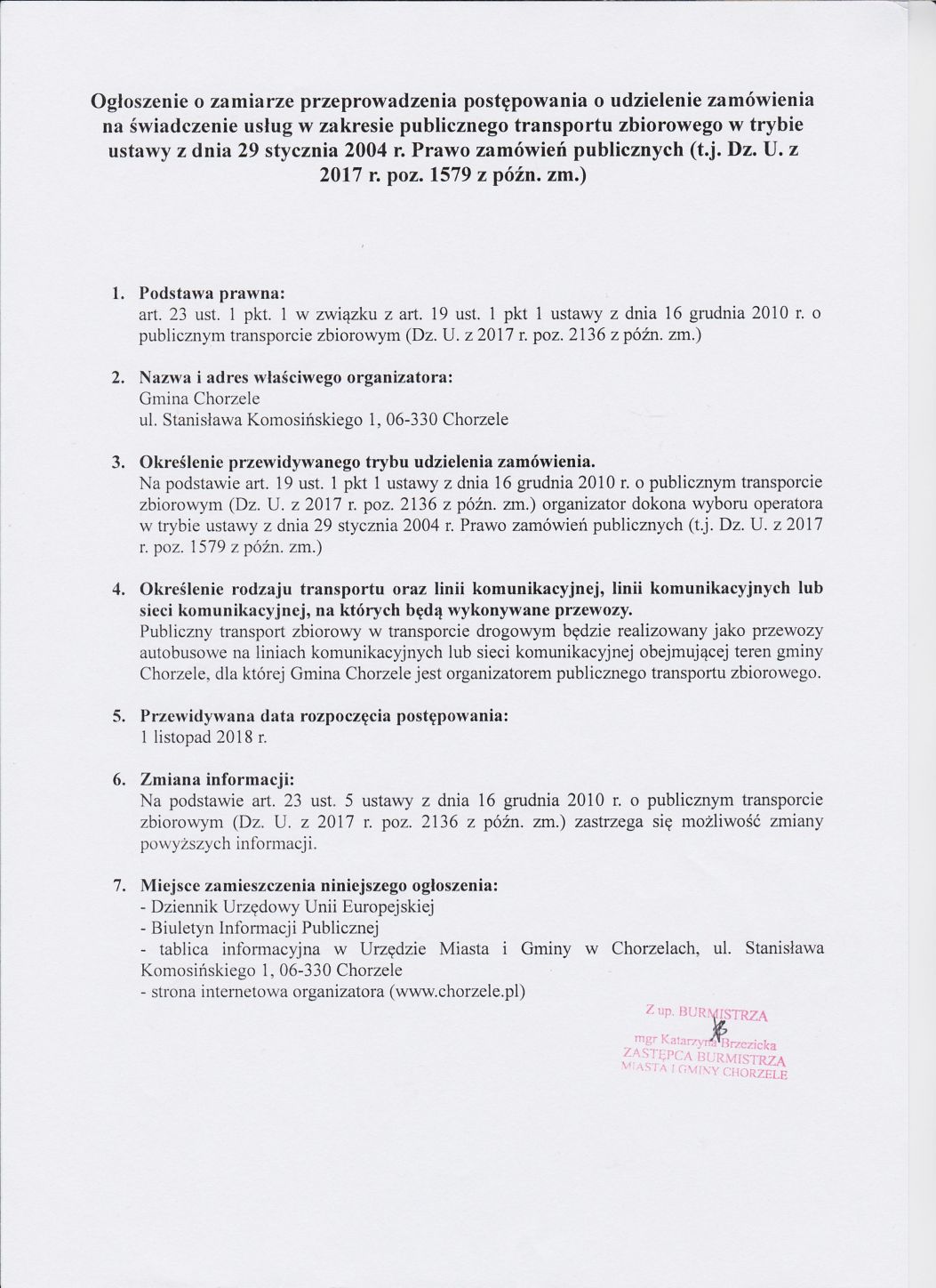 Gmina Chorzele (zwana dalej Zamawiającym), działając na podstawie art. 38 ustawy z dnia 21 października 2016 r. o umowie koncesji na roboty budowlane lub usługi (Dz.U. z 2016 r. poz. 1920), informuje, iż w postępowaniu o udzielenie koncesji na „Świadczenie usług publicznego transportu zbiorowego na terenie gminy Chorzele” na podstawie kryteriów oceny oferty, została wybrana jako najkorzystniejsza oferta firmy: