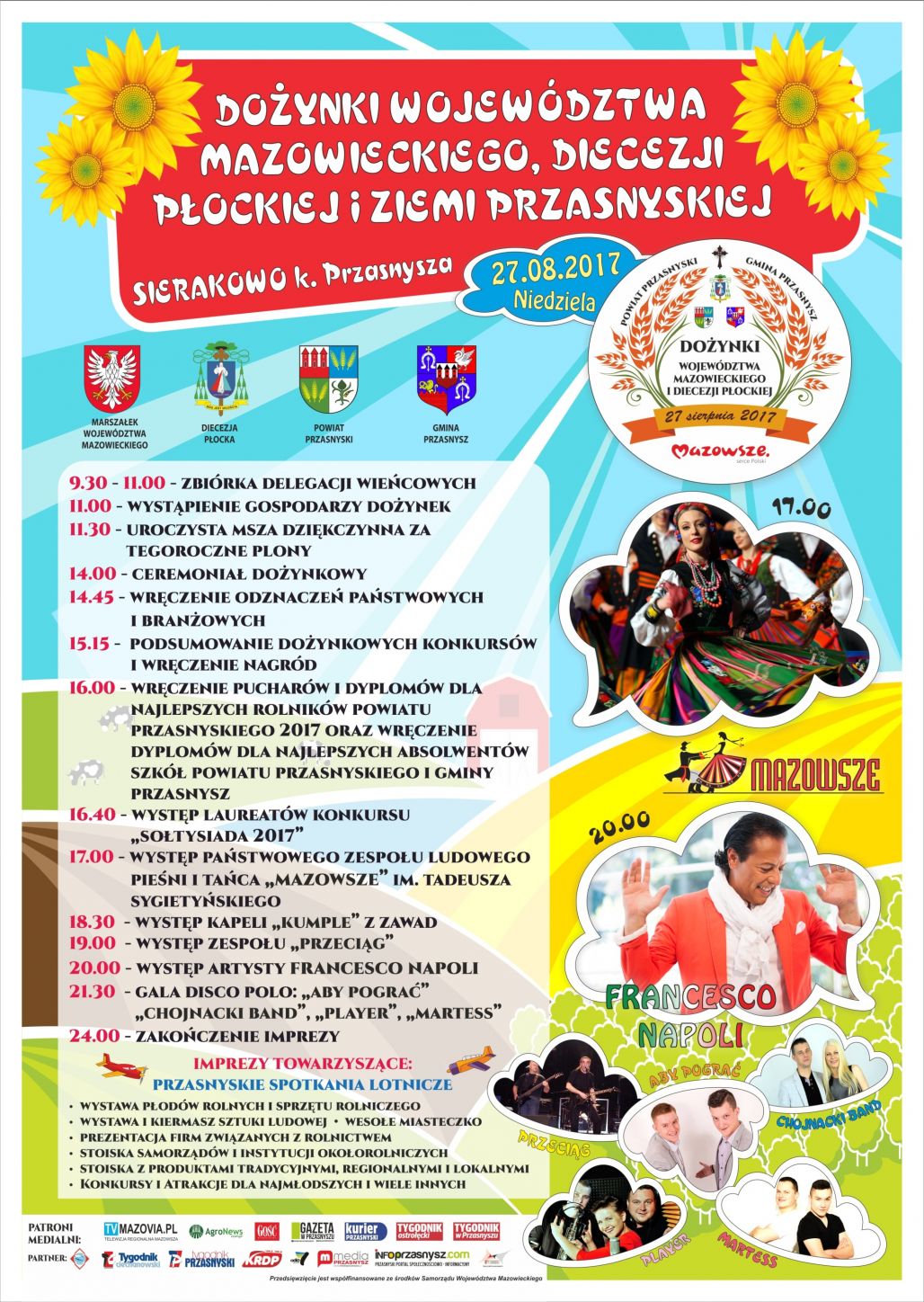 Już w niedzielę, 27 sierpnia, na zakończenie wakacji, Marszałek Województwa Mazowieckiego, Biskup  Płocki, Starosta Przasnyski i Wójt Gminy Przasnysz zapraszają na lotnisko w Sierakowie k. Przasnysza, gdzie odbędą się „Dożynki Województwa Mazowieckiego, Diecezji Płockiej i Ziemi Przasnyskiej”.