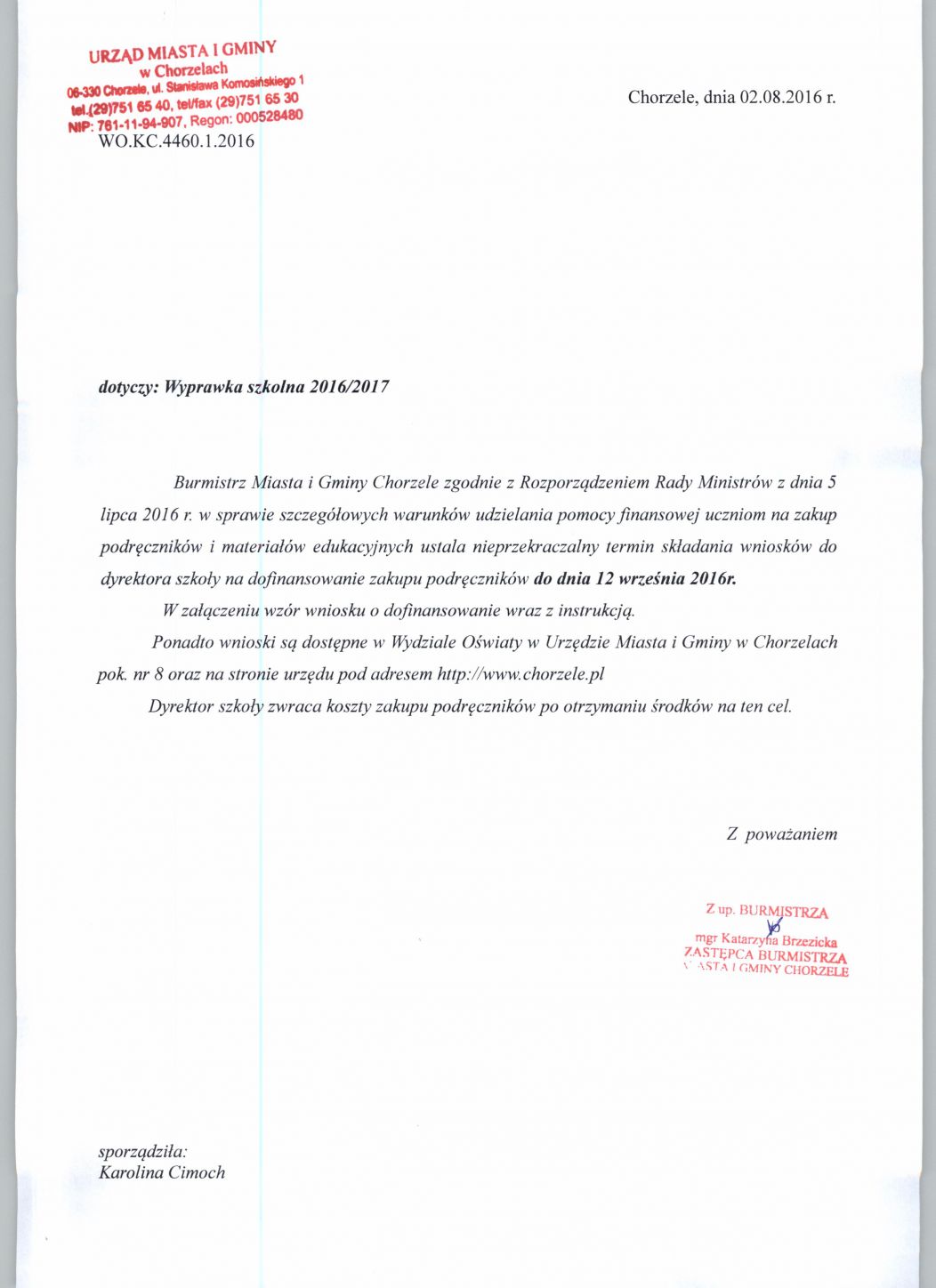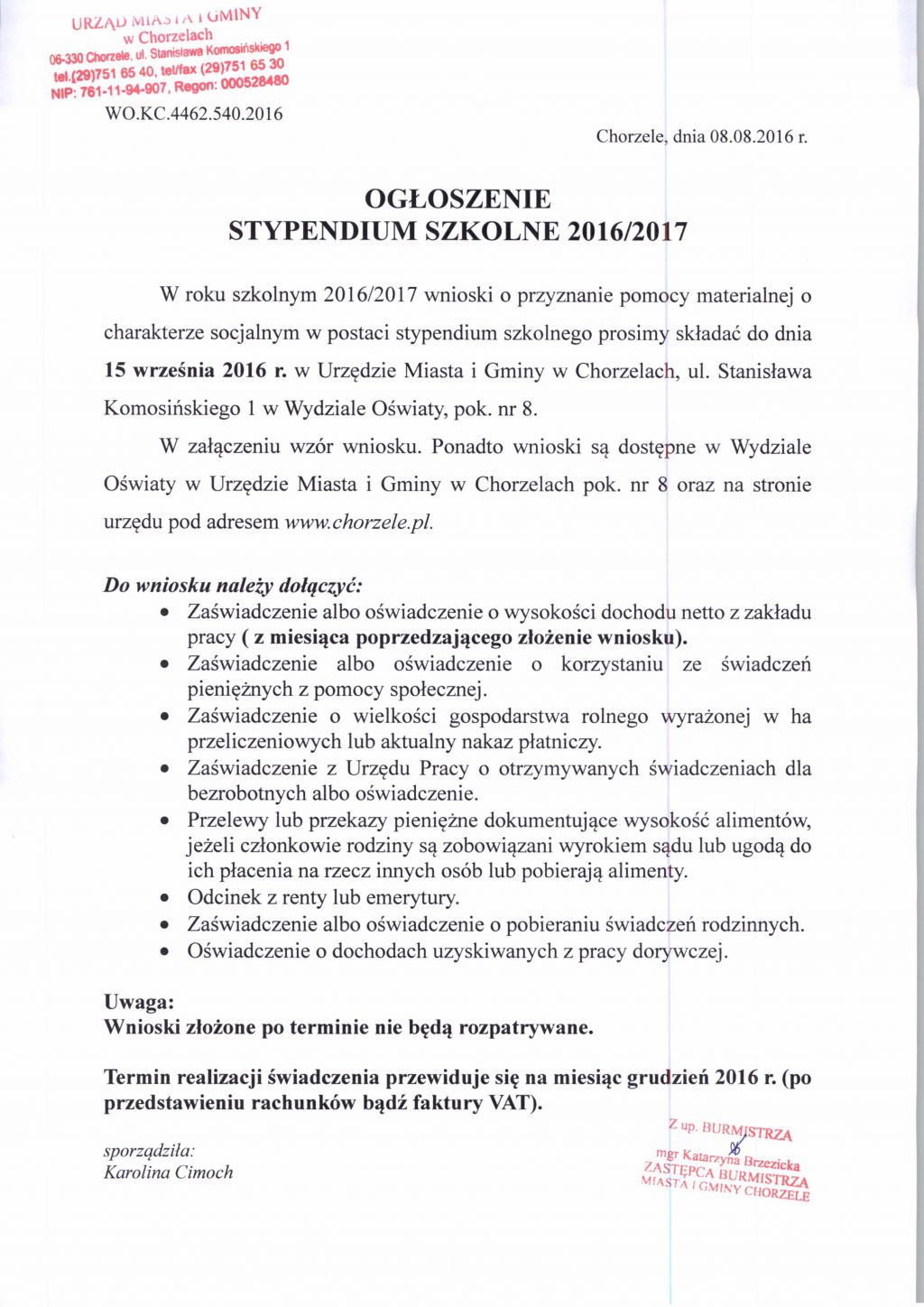 Ponadto wnioski są dostępne w Wydziale Oświaty w Urzędzie Miasta i Gminy w Chorzelach pok. nr 8 oraz na stronie urzędu pod adresem http://www. chorzele.pl
