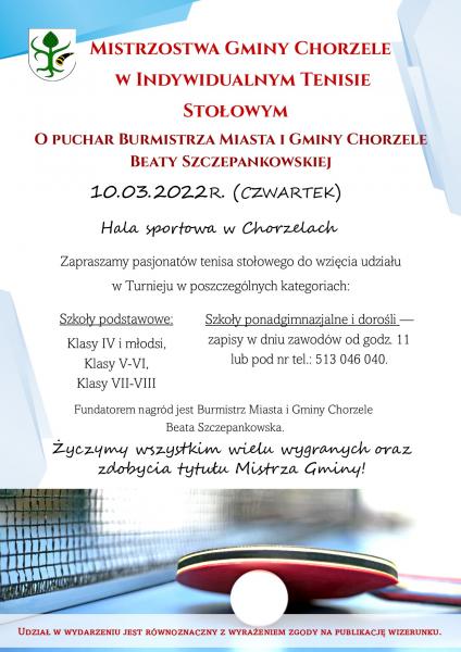 Obrazek Mistrzostwa Gminy Chorzele  w Indywidualnym Tenisie Stołowym O Puchar Burmistrza Miasta i Gminy Chorzele Beaty Szczepankowskiej:
