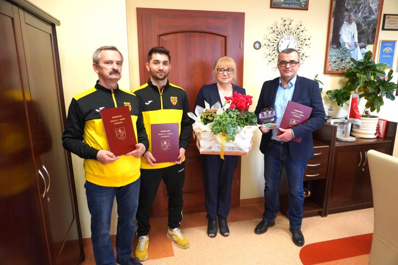 Przedstawiciele KS Orzyc Chorzele również podziękowali burmistrz Beacie Szczepankowskiej za dotychczasową, bardzo dobrą współpracę, wsparcie i zrozumienie potrzeb oraz wręczyli piękne kwiaty.