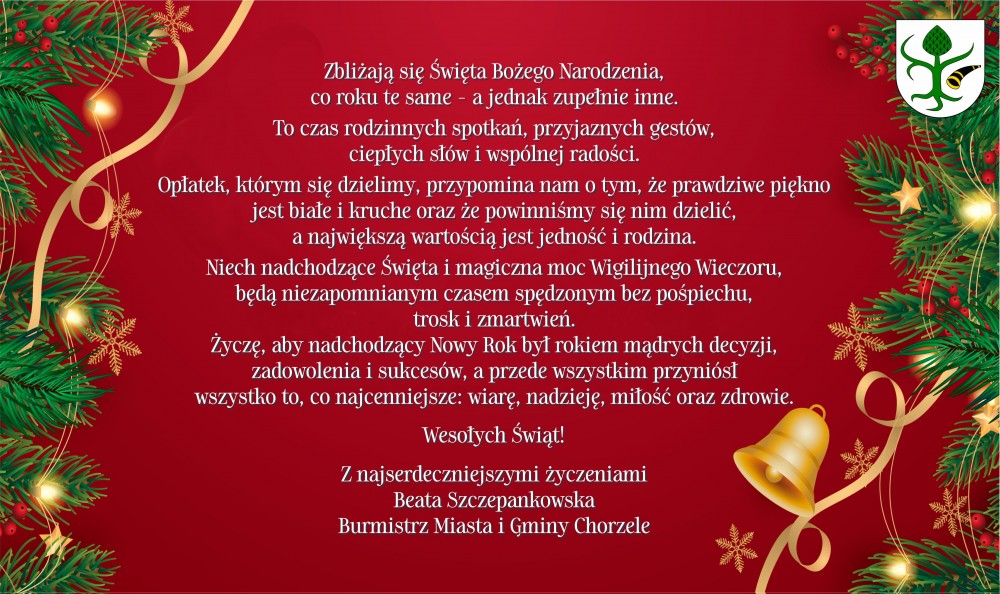 Szanowni Państwo Drodzy Mieszkańcy Miasta i Gminy Chorzele, Powiatu Przasnyskiego oraz Regionu Przyjmijcie najserdeczniejsze życzenia z okazji nadchodzących Świąt.  Życzę Państwu, żebyście przeżyli Wielkanoc w atmosferze szczególneg...