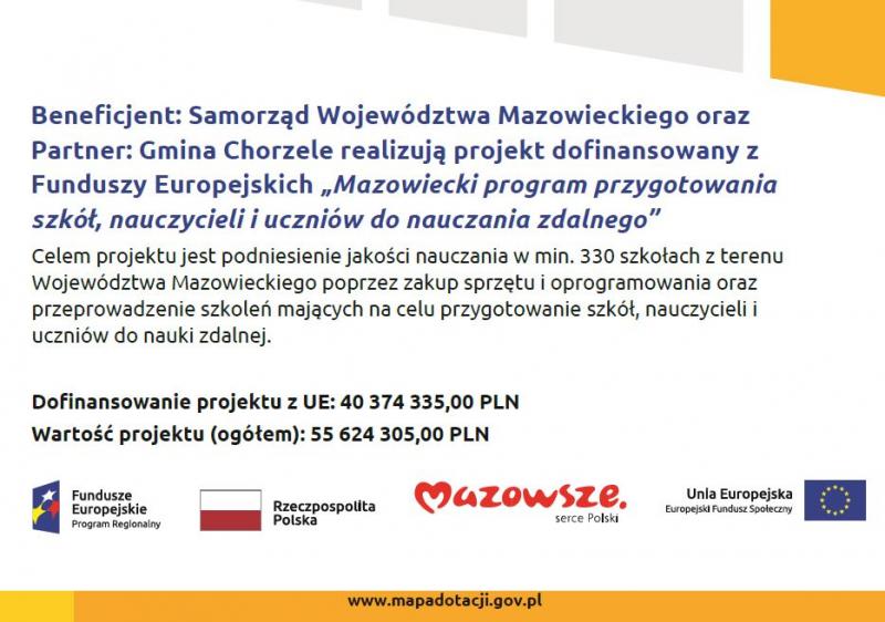 Beneficjent: Samorząd Województwa Mazowieckiego oraz Partner: Gmina Chorzele realizują projekt dofinansowany z Funduszy Europejskich „Mazowiecki program przygotowania szkół, nauczycieli i uczniów do nauczania zdalnego" - plakat znajduje się tutaj.