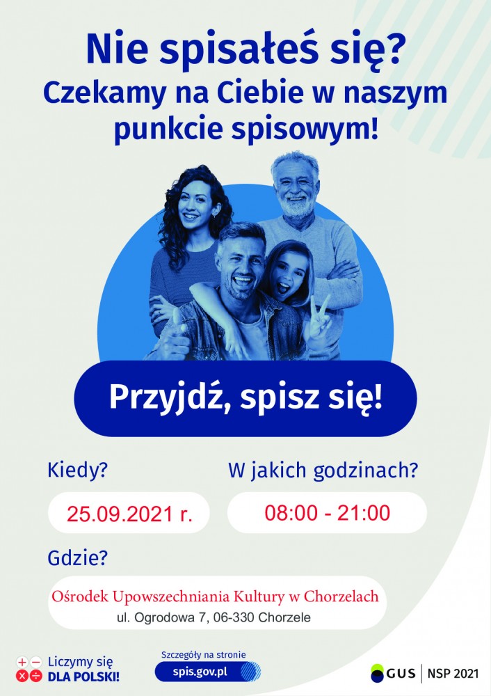 Obrazek Zapraszamy wszystkich mieszkańców, którzy dotychczas się nie spisali w Narodowym Spisie Powszechnym Ludności i Mieszkań 2021 do Gminnego Punktu Spisowego, który będzie czynny w dniu 25 września (sobota) w godzinach 8:00– 21:00 w budynku Ośrodka Upowszechniania