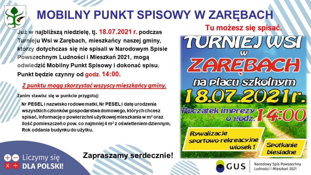 Mieszkańcy naszej gminy, którzy dotychczas się nie spisali w Narodowym Spisie Powszechnym Ludności i Mieszkań 2021, mogą odwiedzić Mobilny Punkt Spisowy i dokonać spisu podczasTurnieju Wsi w Zarębach.
