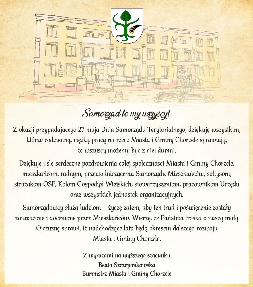 Szanowni Państwo Drodzy Mieszkańcy Miasta i Gminy Chorzele, Powiatu Przasnyskiego oraz Regionu Przyjmijcie najserdeczniejsze życzenia z okazji nadchodzących Świąt.  Życzę Państwu, żebyście przeżyli Wielkanoc w atmosferze szczególneg...