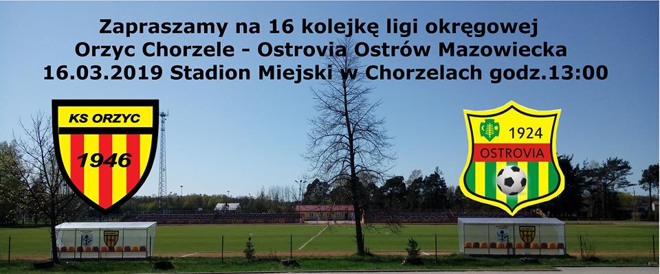 Serdecznie zapraszamy na 16 kolejkę ligi okręgowej Orzyc Chorzele - Ostrovia Ostrów Mazowiecka, która odbędzie się 16.03.2019r. na Stadionie Miejskim w Chorzelach o godz. 13:00!