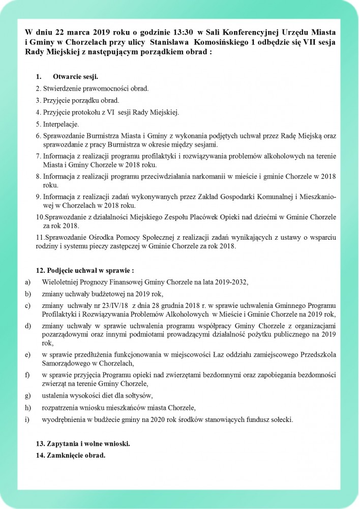 W dniu 22 marca 2019 roku o godzinie 13:30 w Sali Konferencyjnej Urzędu Miasta i Gminy w Chorzelach przy ulicy Stanisława Komosińskiego 1 odbędzie się VII sesja Rady Miejskiej z następującym porządkiem obrad :
