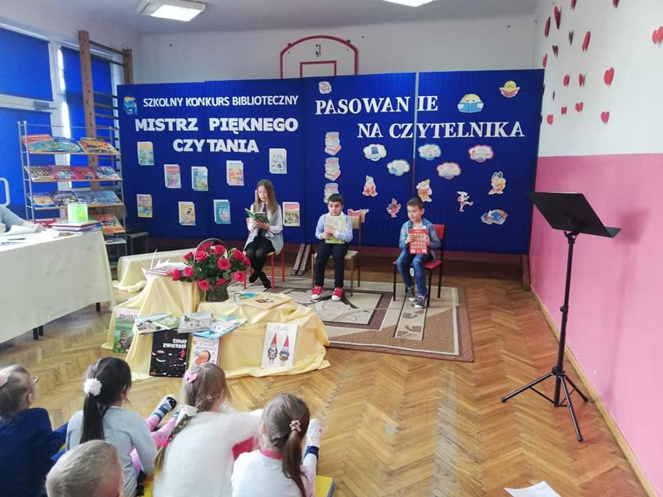 Pasowanie pierwszoklasistów na czytelnika, połączone ze szkolnym konkursem "Mistrz Pięknego Czytania" w Publicznej Szkole Podstawowej w Pościeniu Wsi.