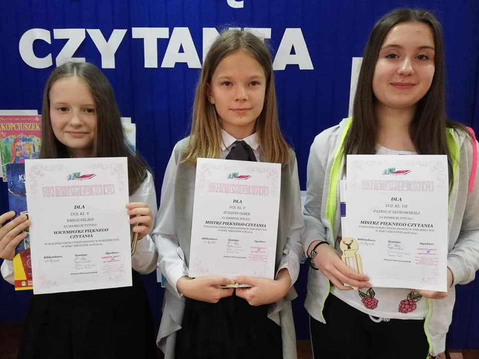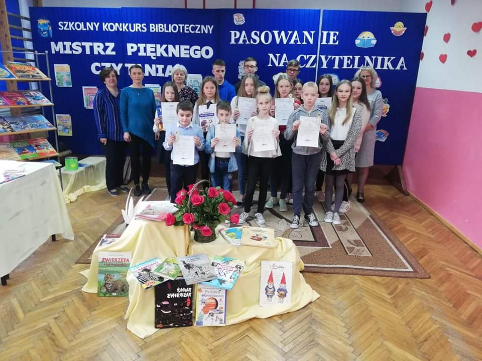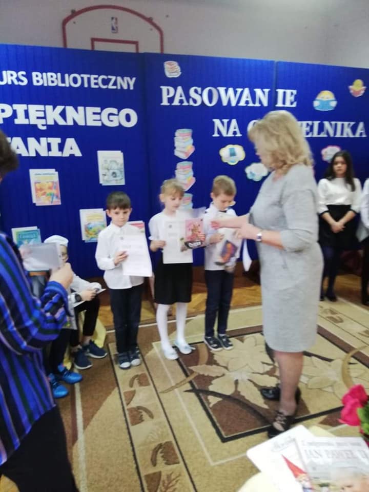 Pasowanie pierwszoklasistow na czytelnika połączone ze szkolnym konkursem "Mistrz Pięknego Czytania" to wydarzenia upływającego tygodnia. Uczniowie pierwszej klasy zostali uroczyście zapisani do biblioteki szkolnej. Są już prawdziwymi przyjaciółmi książki. Pierwszaki otrzymały upominki i gratulacje oraz kilka rad właściwego korzystania z książek. Uroczystości towarzyszył konkurs, w którym wyłoniono Mistrza, a nawet dwóch, a właściwie dwie Mistrzynie i Wicemistrzynie Pięknego Czytania. W konkursie udział wzięło 12 uczestników, którzy zaprezentowali fragment przez siebie wybranego tekstu. Komisja składająca się z nauczycieli i przedstawicieli samorządu uczniowskiego wnikliwie oceniała uczestników konkursu. Tytuł Mistrza Pięknego Czytania zdobyły: Zuzanna Olber i Patrycja Sedrowska. Wicemistrzem została Emilia Szlaga. Wszyscy uczestnicy otrzymali pamiątkowe dyplomy. Gratulujemy zwycięzcom i dziękujemy za udział.