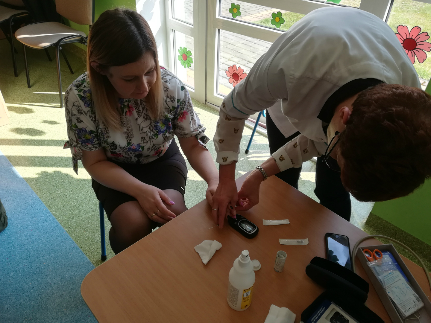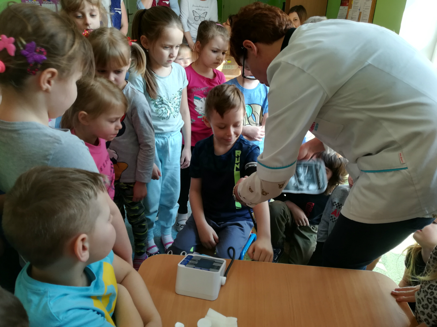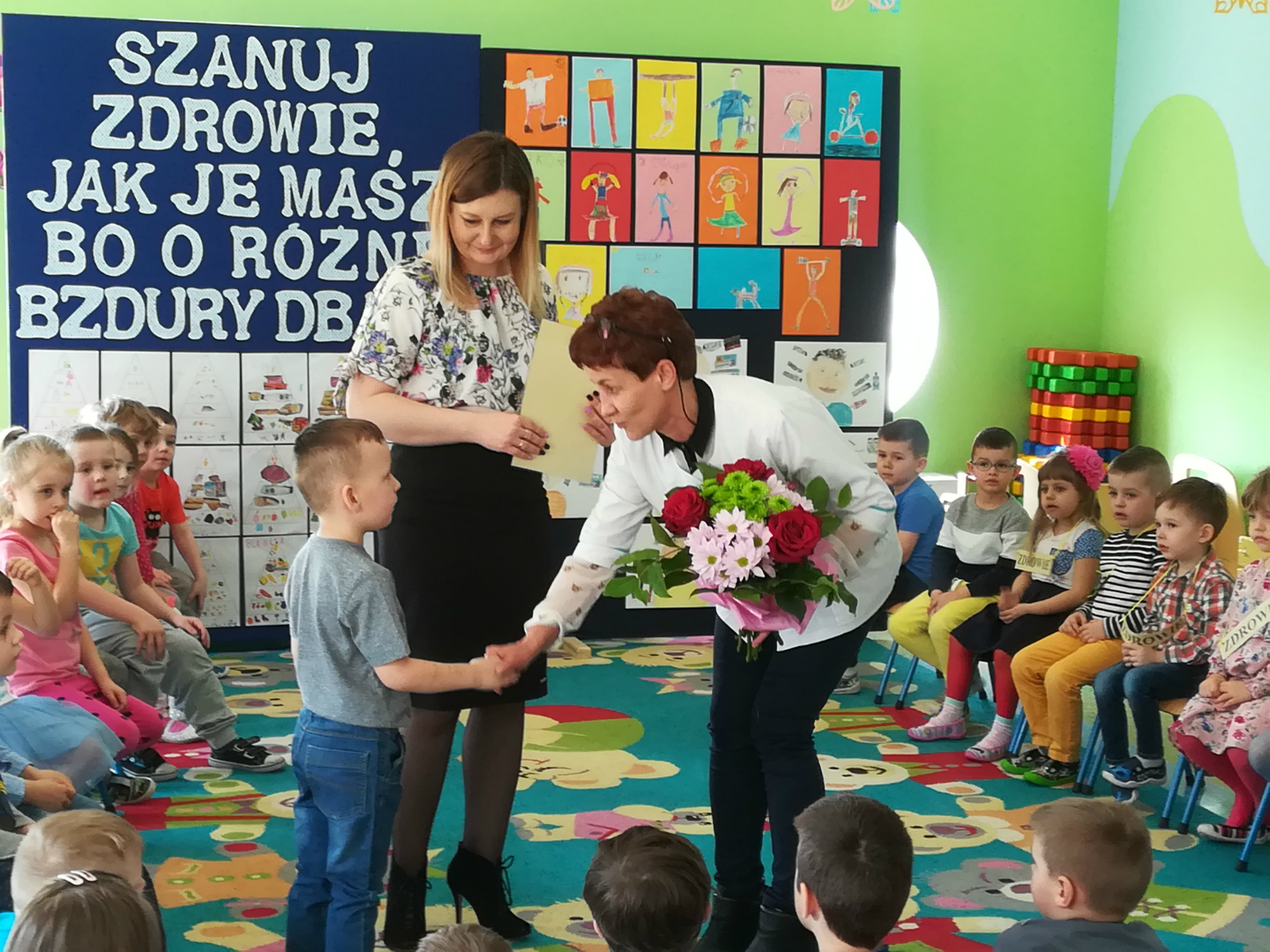 Grupa „Motylki” przygotowała krótką część artystyczną. Zaprosiliśmy także specjalnego gościa, panią pielęgniarkę Dorotę, która zapoznała dzieci ze specyfiką zawodu. Pani Dorota uświadomiła jak ważny jest zawód pielęgniarki, która każdego dnia pomaga ludziom. Nasi milusińscy z zainteresowaniem oglądali sprzęt potrzebny sanitariuszom do codziennej pracy. Wspaniałą zabawą okazało się bandażowanie ręki i mierzenie ciśnienia. Poprzez zabawę mogły doświadczyć przyjazną stronę wykonania zastrzyku. Pielęgniarka zachęcała dzieci do spożywania owoców i warzyw, które zawierają mnóstwo witamin niezbędnych w diecie każdego przedszkolaka. Wszystkie przedszkolaki brały udział w dyskusji i odpowiadały na pytanie „co to jest zdrowie?", co możemy zrobić aby zdrowie zachować? Tego dnia dzieci opowiadały jak należy dbać o zdrowie. Przypomniały sobie o zasadach higieny, prowadzeniu zdrowego trybu życia oraz właściwego odżywiania się. Zajęcia uświadomiły przedszkolakom jak ważny jest sport i ruch na świeżym powietrzu. Na koniec przedszkolaki serdecznie podziękowały pani Dorocie za przekazanie wiedzy istotnej w życiu każdego z nas. Życzyły dalszych sukcesów w pracy oraz zadowolenia z niesienia pomocy innym. Spotkanie upłynęło w bardzo miłej atmosferze. Mamy nadzieję, że w przyszłości wizyta dzieci w gabinecie lekarskim nie będzie budziła nieprzyjemnych uczuć.