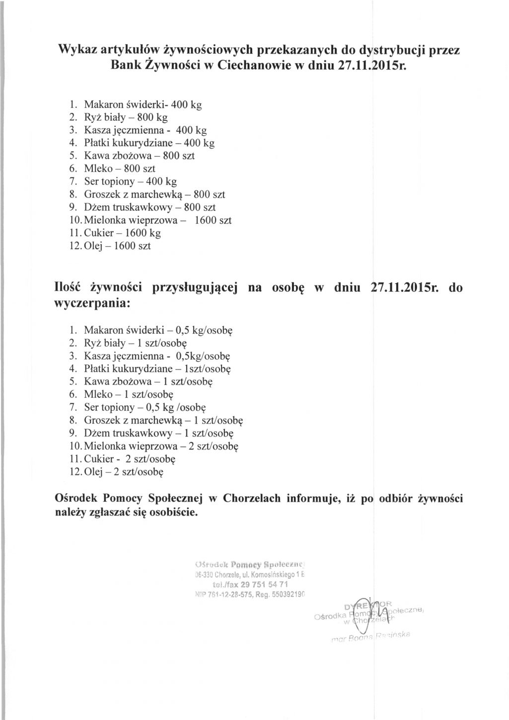 Informacja Ośrodka Pomocy społeczenj w Chorzelach odnośnie wydawania żywności