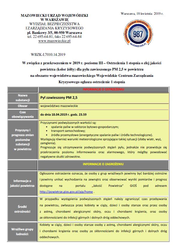 W związku z przekroczeniem w 2019 r. poziomu III – Ostrzeżenia 1 stopnia o złej jakości powietrza (kolor żółty) dla pyłu zawieszonego PM 2,5 w powietrzu na obszarze województwa mazowieckiego Wojewódzkie Centrum Zarządzania Kryzysowego ogłasza ostrzeżenie 1 stopnia