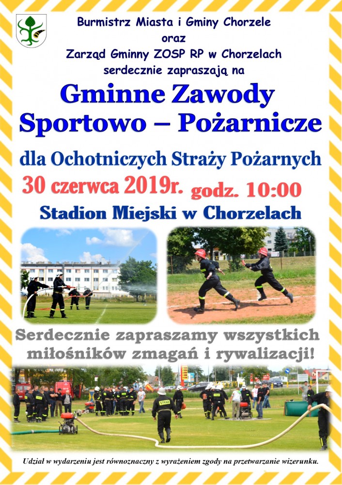 Burmistrz Miasta I Gminy Chorzele oraz Zarząd Gminny ZOSP RP w Chorzelach serdecznie zapraszają na Gminne Zawody Sportowo - Pożarnicze dla Ochotniczych Straży Pożarnych, które odbędą się 30 czerwca 2019r. godz. 10:00 na Stadionie Miejskim w Chorzelach.