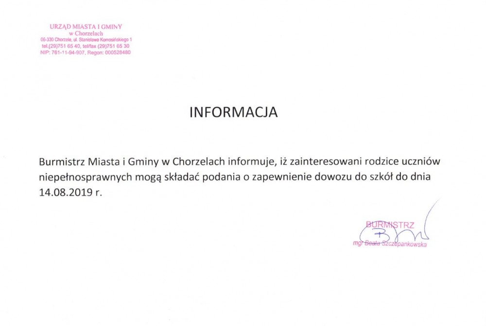 Burmistrz Miasta i Gminy w Chorzelach informuje, iż zainteresowani rodzice uczniów niepełnosprawnych mogą składać podania o zapewnienie dowozu do szkół do dnia 14.08.2019r.
