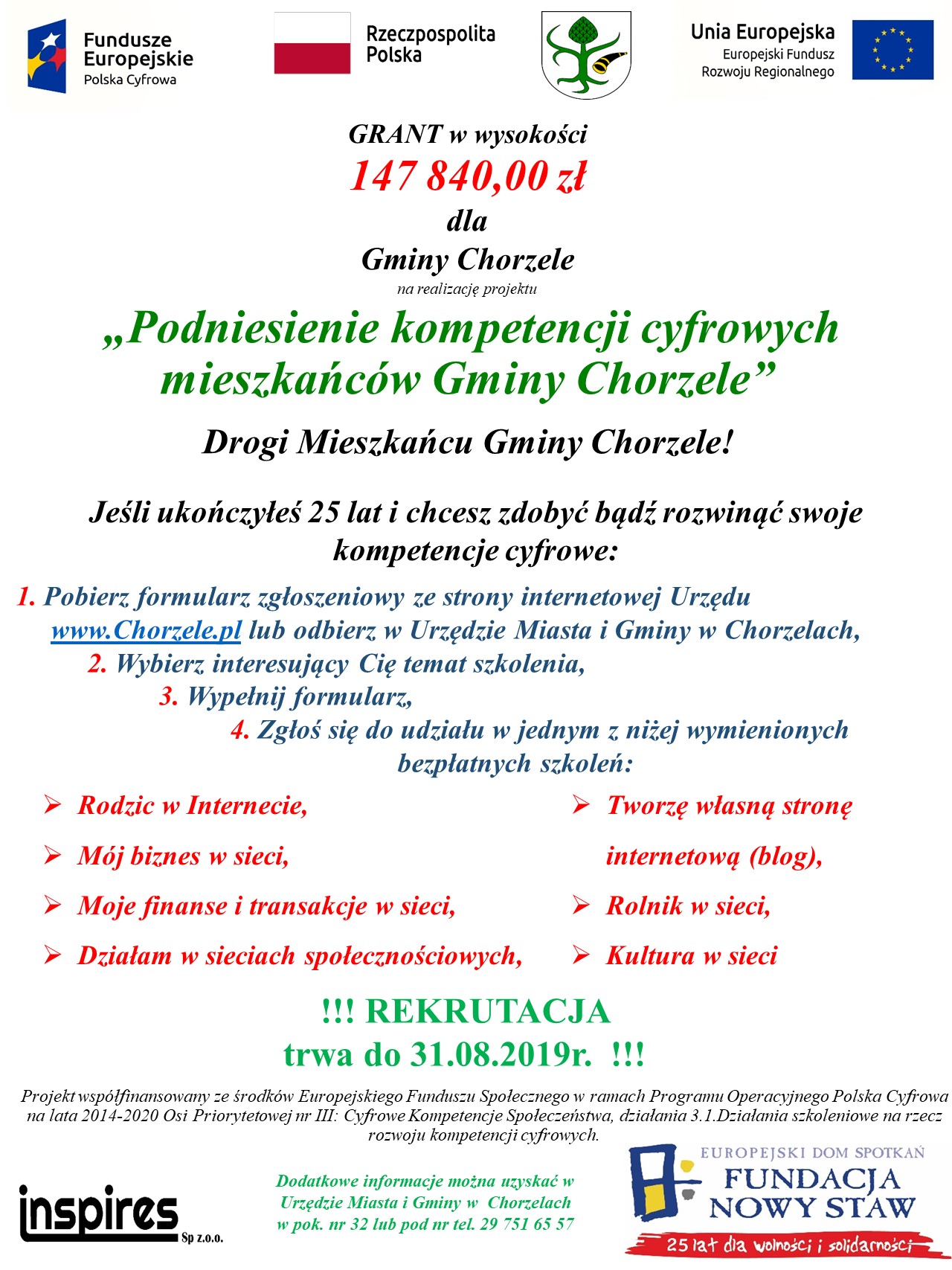 W dniu 01.07.2019r. została podpisana umowa z Europejskim Domem Spotkań – Fundacją Nowy Staw o powierzenie grantu w ramach Programu Operacyjnego Polska Cyfrowa na lata 2014-2020 Osi Priorytetowej nr III: Cyfrowe Kompetencje Społeczeństwa, działania 3.1: Działania szkoleniowe na rzecz rozwoju kompetencji cyfrowych, przedmiotem której jest udzielenie dofinansowania na realizację projektu pn. „Podniesienie kompetencji cyfrowych mieszkańców Gminy Chorzele”.