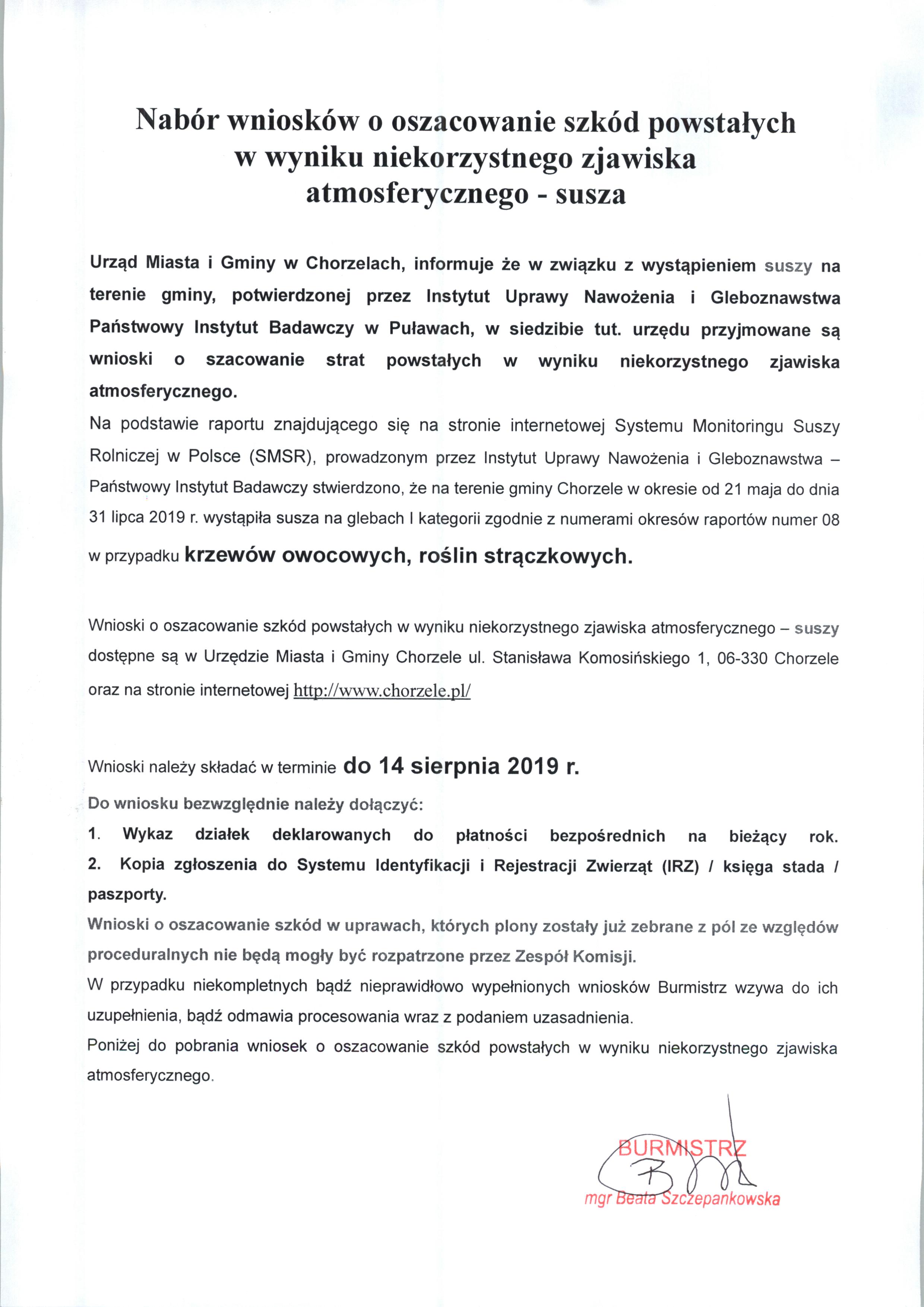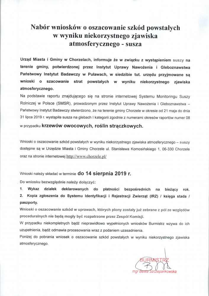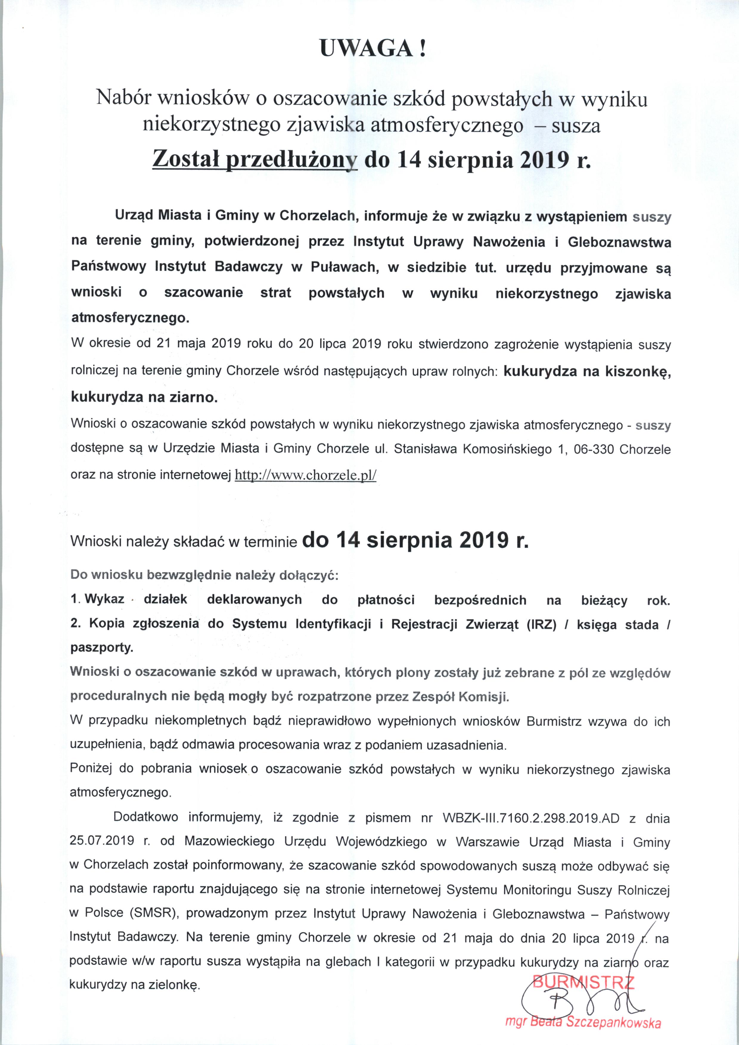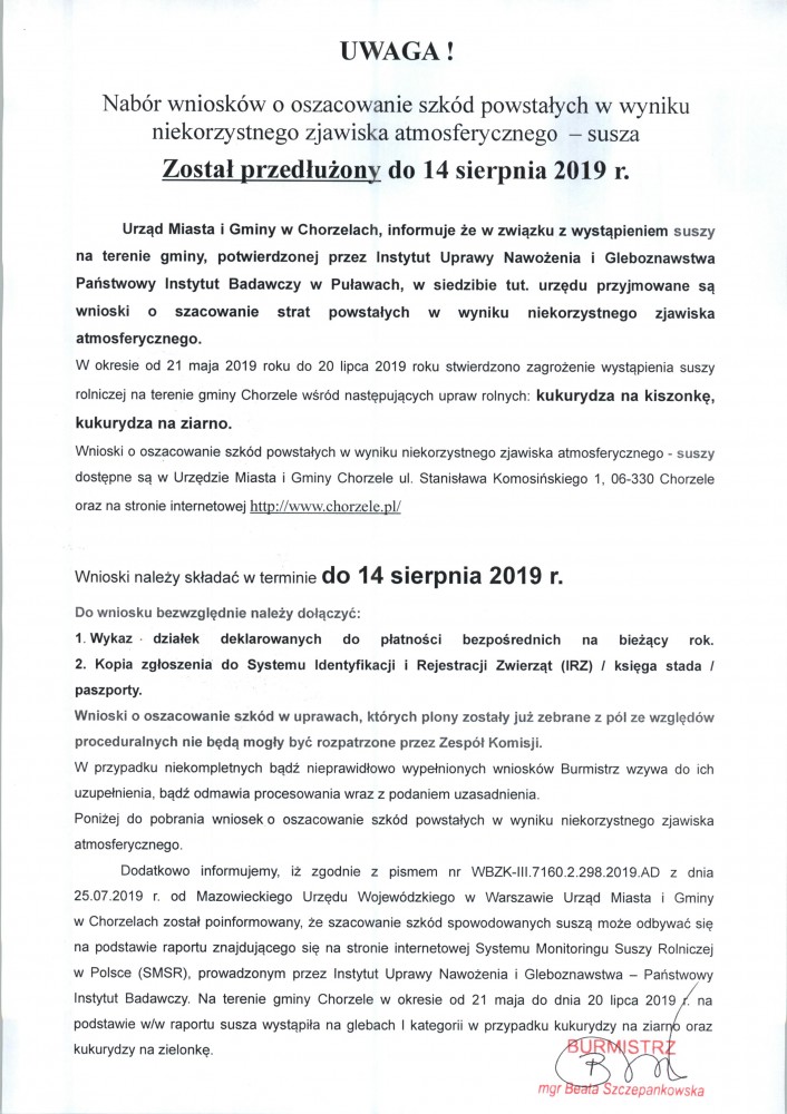 Nabór wniosków o oszacowanie szkód powstałych w wyniku niekorzystnego zjawiska atmosferycznego - susza został przedłużony do 14 sierpnia 2019r.