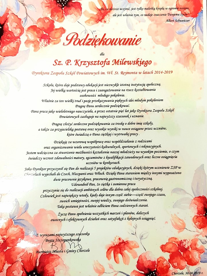 Człowiek jest największy wtedy, kiedy daje innym część siebie-część swojego czasu, swoich umiejętności, swojej wiedzy, swojego doświadczenia. Burmistrz Miasta i Gminy Chorzele Beata Szczepankowska podziękowała i wyraziła wdzięczność, szacunek oraz uznanie Krzysztofowi Milewskiemu, dyrektorowi ZSP w Chorzelach w latach 2014-2019.