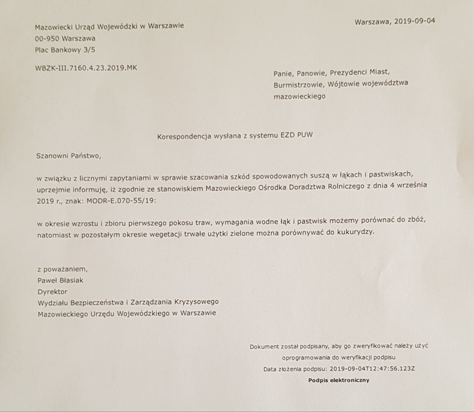 ZABIEGI BURMISTRZ DOTYCZĄCE SKUTKÓW SUSZY SKUTECZNE! JEST ZGODA WOJEWODY DLA GMINY CHORZELE NA SZACOWANIE SZKÓD NA UŻYTKACH ZIELONYCH.