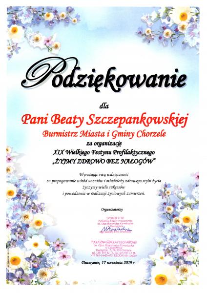 Podziękowanie dla burmistrz Beaty Szczepankowskiej za organizację XIX Wielkiego Festynu Profilaktycznego "Żyjmy zdrowo, bez nałogów"