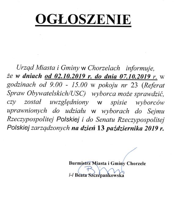 Urząd Miasta i Gminy w Chorzelach informuje, że w dniach od 02.10.2019r. do dnia 07.10.2019r. w godzinach od 9.00- do 15.00 w pokoju nr 23 wyborca może sprawdzić, czy został uwzględniony w spisie wyborców uprawnionych do udziału w wyborach do Sejmu Rzeczypospolitej Polskiej i do Senatu Rzeczypospolitej Polskiej zarządzonych na dzień 13 października 2019r.