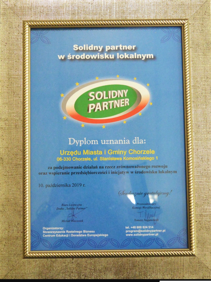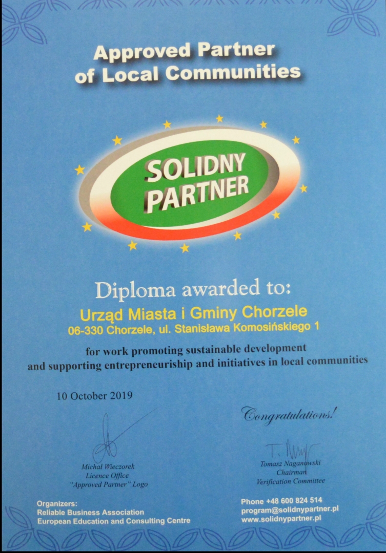 Wyróżnienie jest bezpłatne, a Gmina Chorzele do tej nagrody została rekomendowana przez Urząd Marszałkowski Województwa Mazowieckiego w ramach programu Solidny Partner. Celem programu jest nagradzanie oraz upowszechnianie dobrych i godnych naśladowania praktyk samorządów oraz organizacji i jednostek samorządowych, mających na celu zrównoważony rozwój miast i gmin, przyjazny dla ich mieszkańców, a także pobudzanie aktywności obywatelskiej w środowisku lokalnym oraz budowanie pozytywnych relacji pomiędzy samorządami, nauką i biznesem.