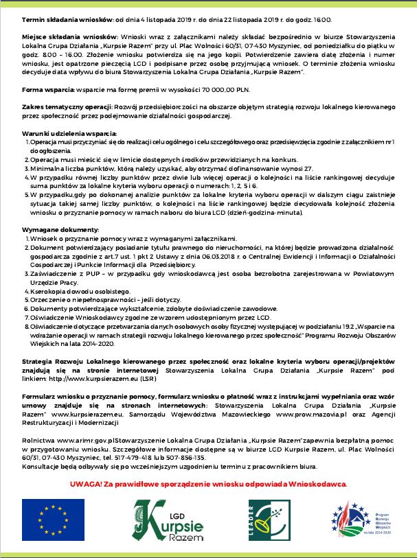 Stowarzyszenie Lokalna Grupa Działania „Kurpsie Razem” informuje o możliwości składania wniosków w ramach działania 19 „Wsparcie dla rozwoju lokalnego w ramach inicjatywy LEADER”, poddziałanie 19.2 „Wsparcie na wdrażanie operacji w ramach strategii rozwoju lokalnego kierowanego przez społeczność” Programu Rozwoju Obszarów Wiejskich na lata 2014-2020 na operacje, które odpowiadają warunkom przyznania pomocy w zakresie rozwoju przedsiębiorczości na obszarze wiejskim objętym strategią rozwoju lokalnego kierowanego przez społeczność przez podejmowanie działalności gospodarczej (limit dostępnych środków: 1 750 000,00 PLN)