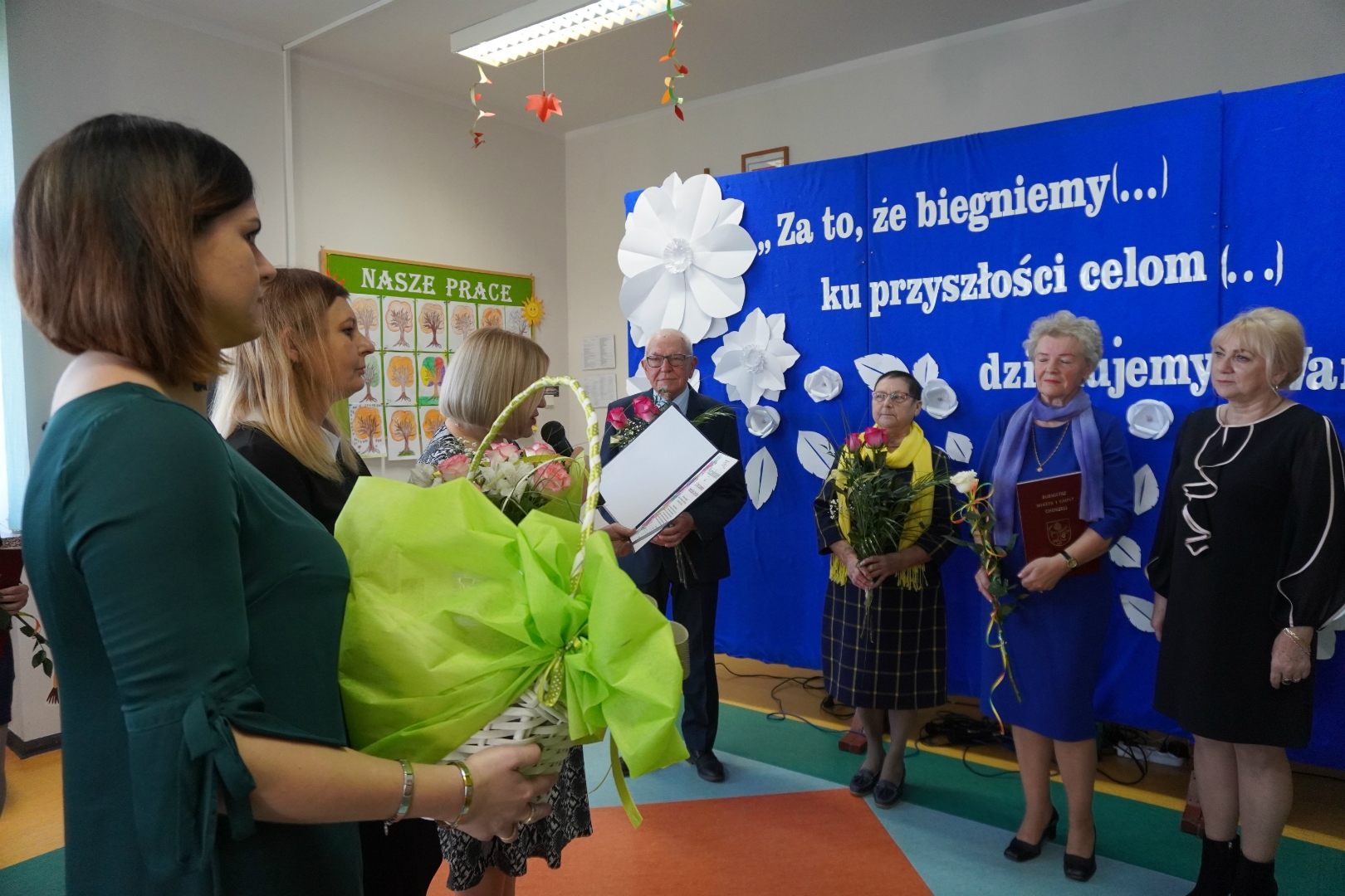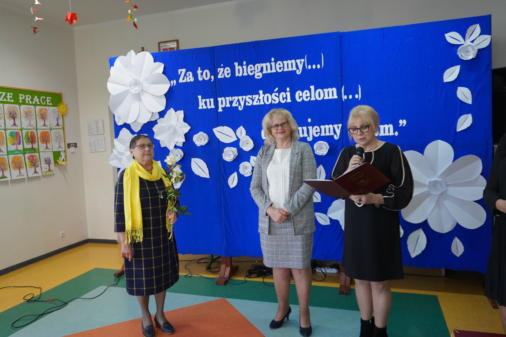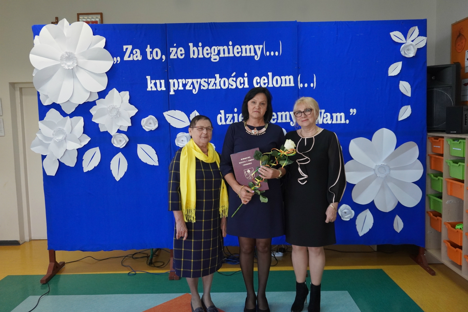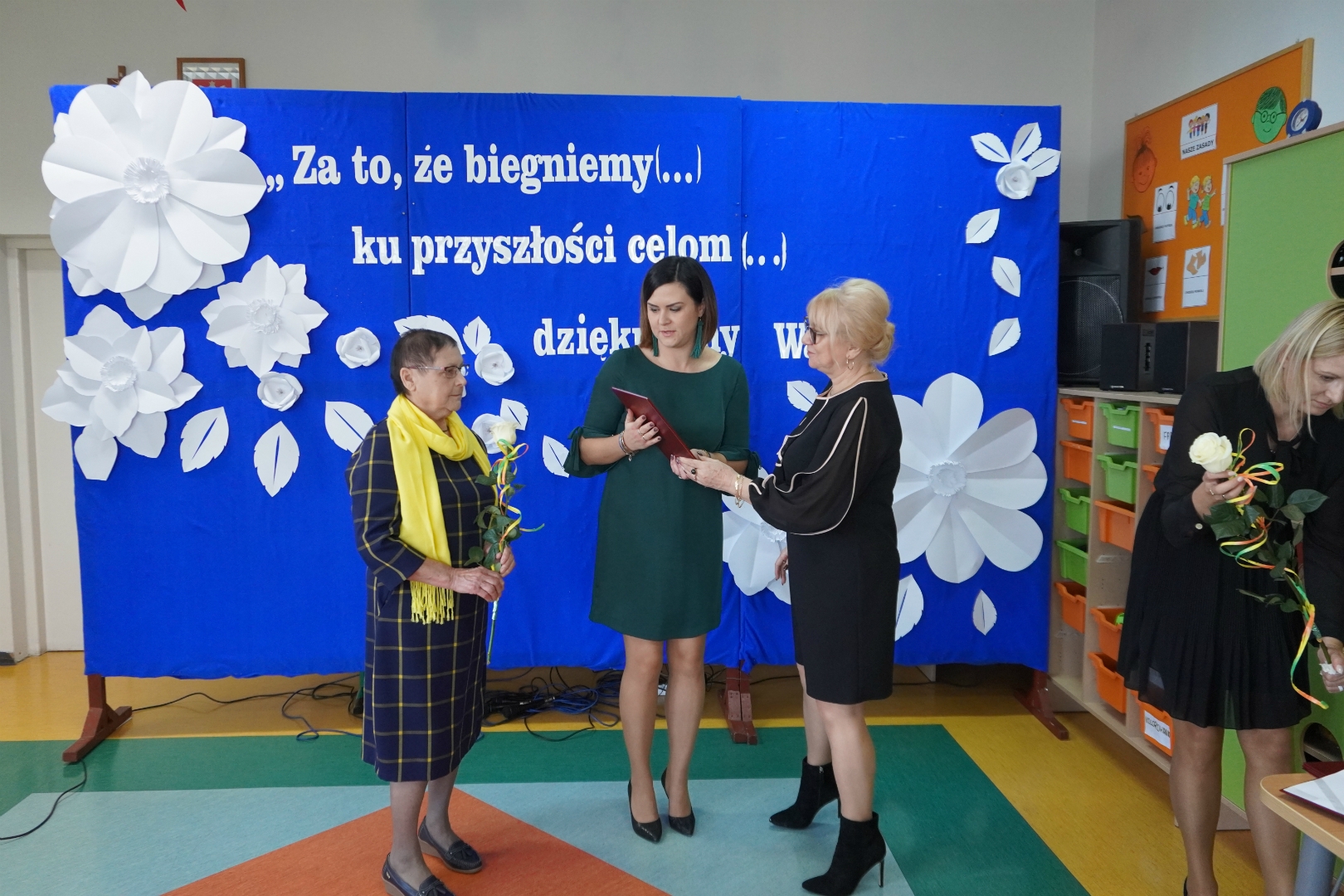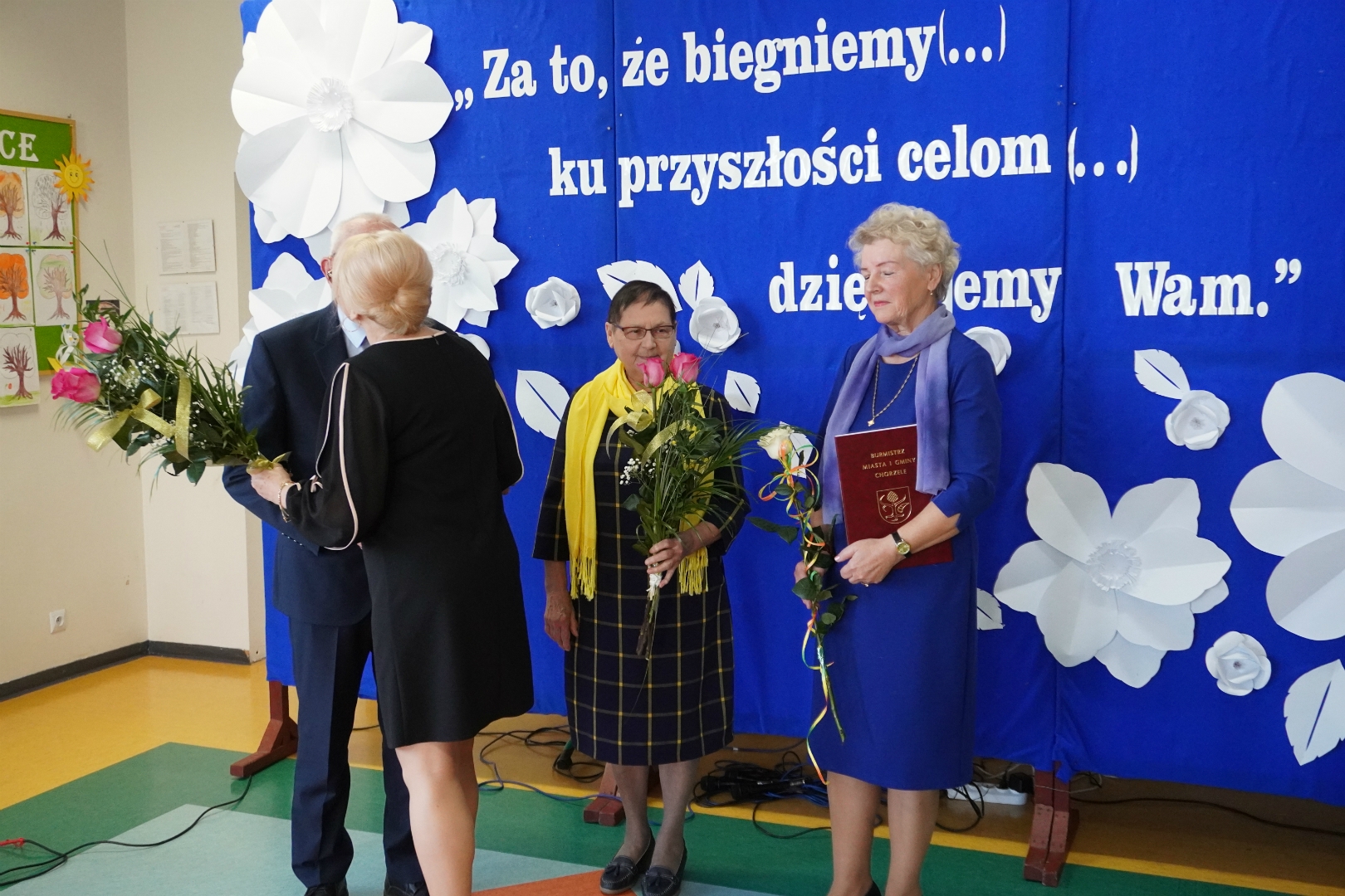Burmistrz doceniła oraz wręczyła list gratulacyjny Kazimierze Kowalskiej -emerytowanej nauczycielce. Podziekowania otrzymała również Wanda Jastrzębska - radna Rady Miejskiej w Chorzelach oraz Ryszard Jastrzębski - Przewodniczący Ogniska Emerytów Związku Nauczycielstwa Polskiego w Chorzelach. Uroczystość poprowadziła Izabela Jurczewska, Dyrektor Wydziału Oświaty Miasta i Gminy Chorzele.
