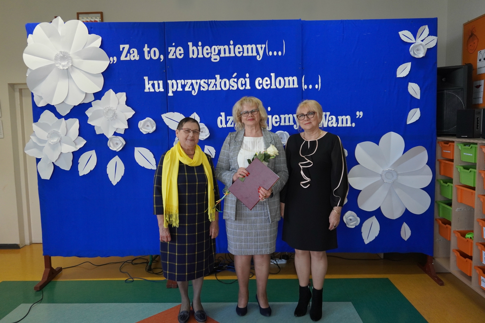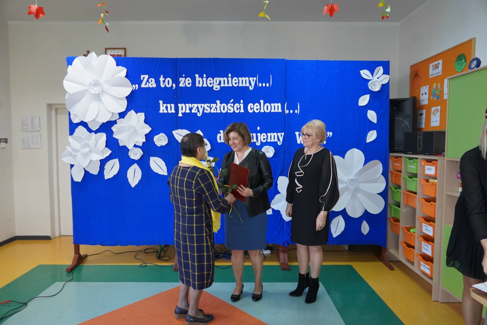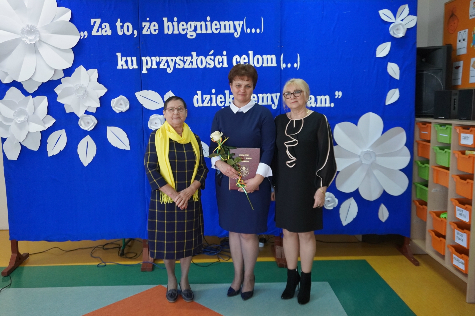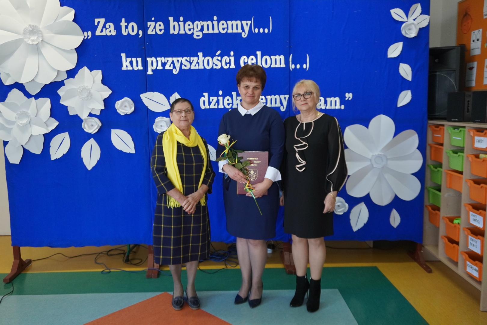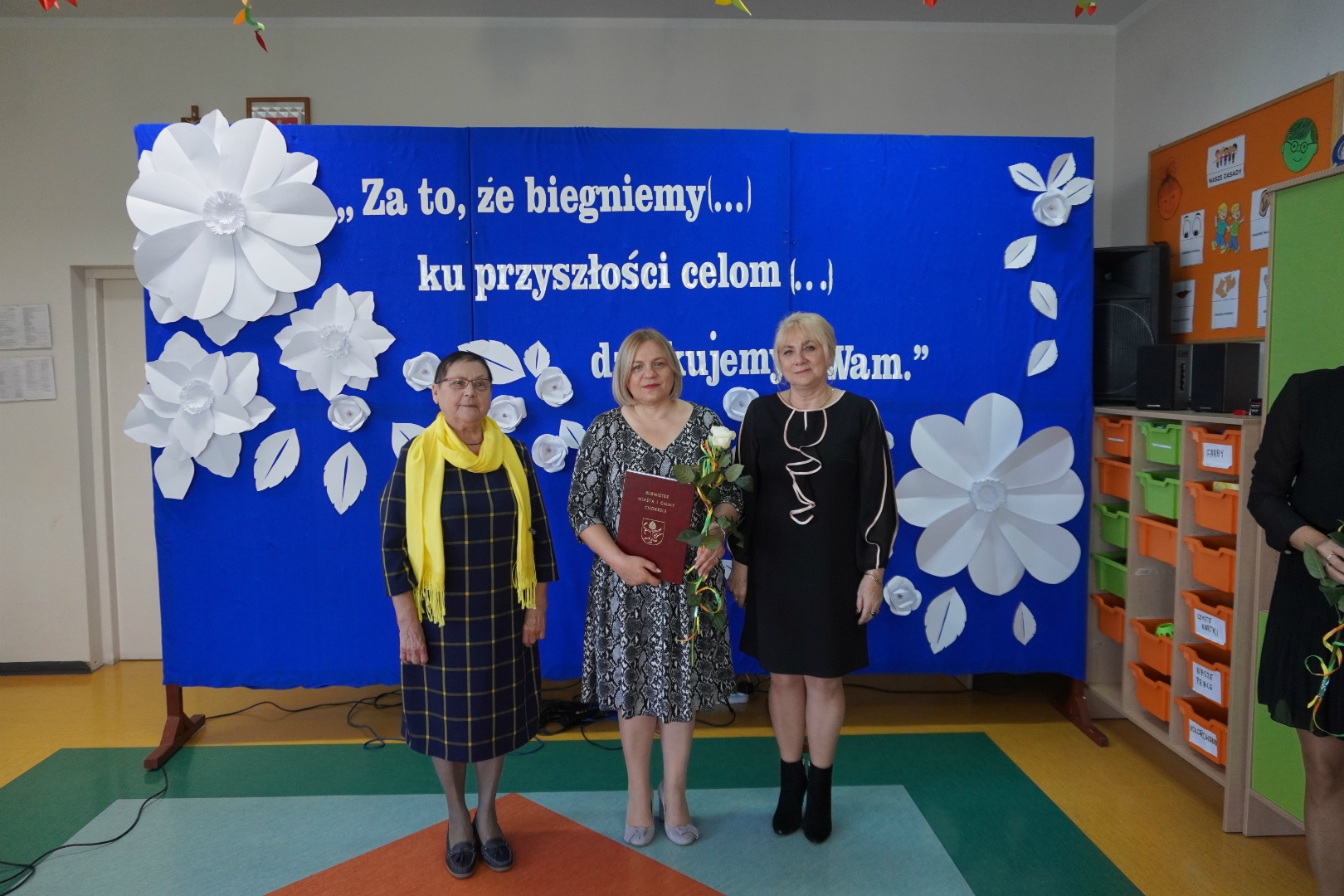Burmistrz doceniła oraz wręczyła list gratulacyjny Kazimierze Kowalskiej -emerytowanej nauczycielce. Podziekowania otrzymała również Wanda Jastrzębska - radna Rady Miejskiej w Chorzelach oraz Ryszard Jastrzębski - Przewodniczący Ogniska Emerytów Związku Nauczycielstwa Polskiego w Chorzelach. Uroczystość poprowadziła Izabela Jurczewska, Dyrektor Wydziału Oświaty Miasta i Gminy Chorzele.