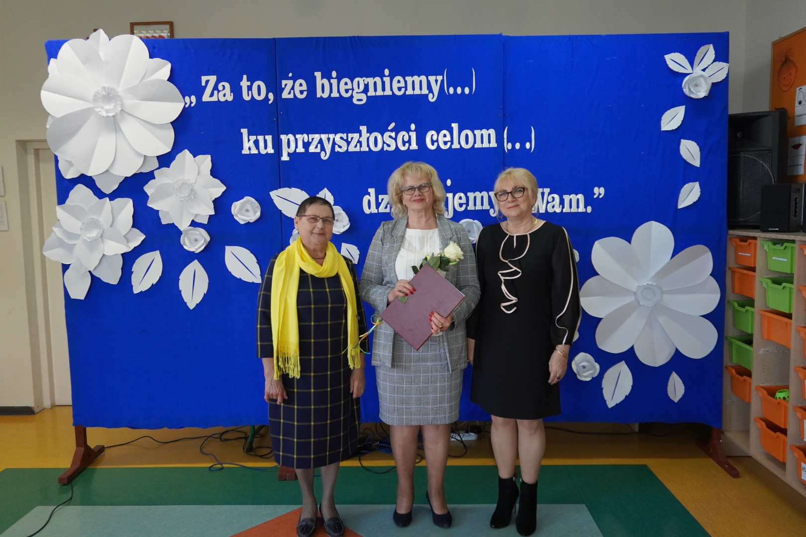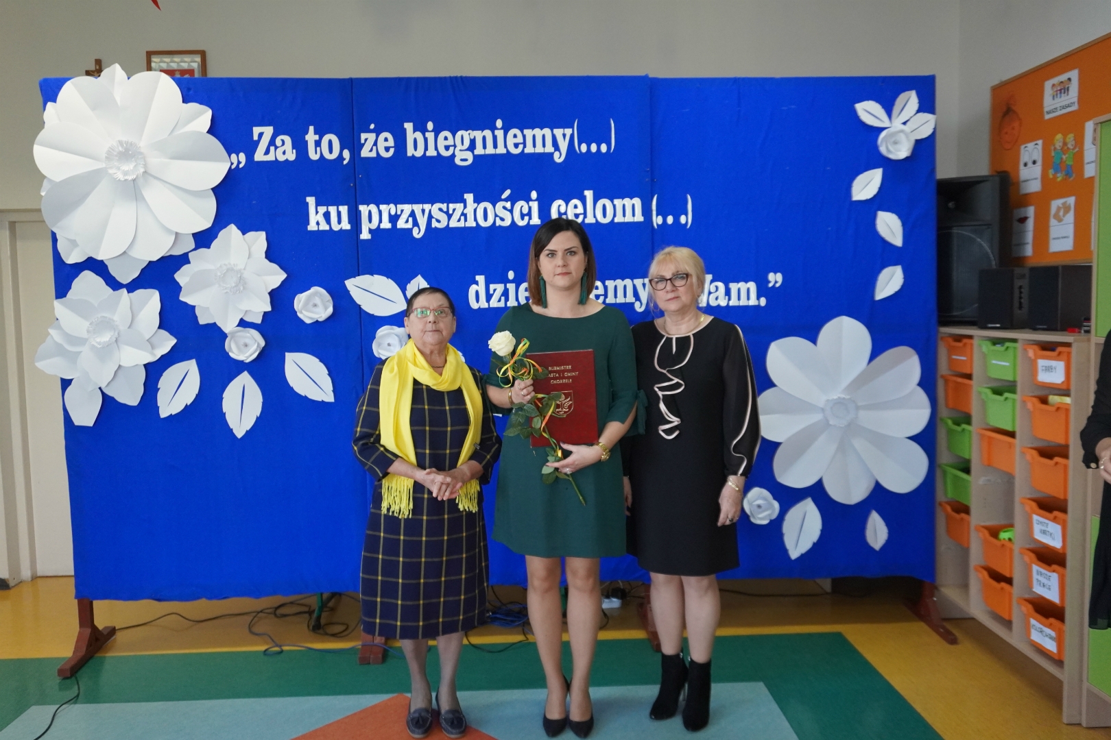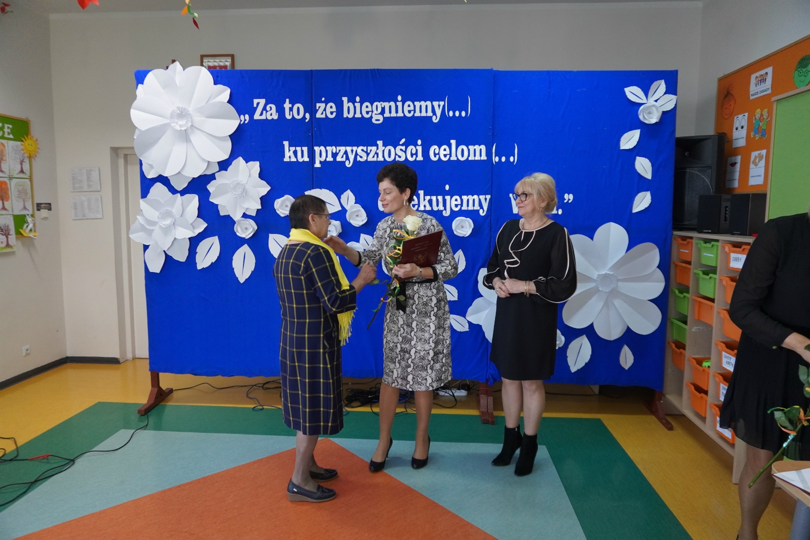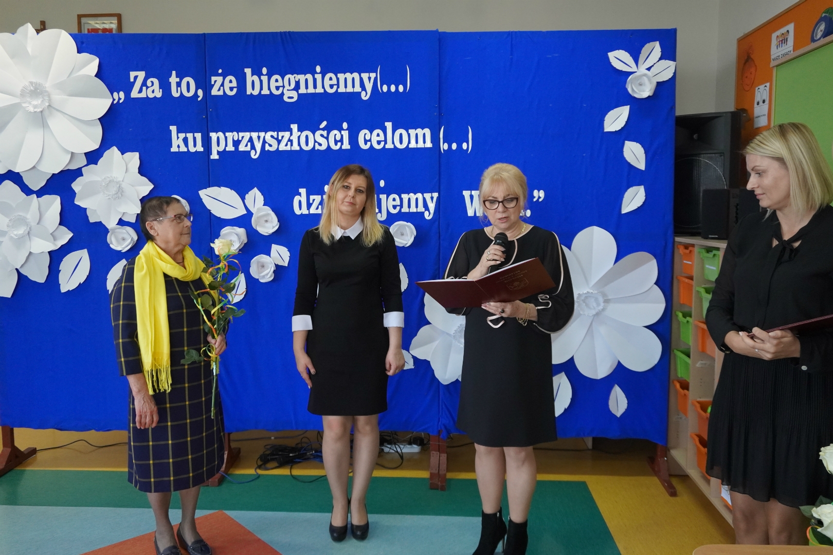 Burmistrz doceniła oraz wręczyła list gratulacyjny Kazimierze Kowalskiej -emerytowanej nauczycielce. Podziekowania otrzymała również Wanda Jastrzębska - radna Rady Miejskiej w Chorzelach oraz Ryszard Jastrzębski - Przewodniczący Ogniska Emerytów Związku Nauczycielstwa Polskiego w Chorzelach. Uroczystość poprowadziła Izabela Jurczewska, Dyrektor Wydziału Oświaty Miasta i Gminy Chorzele.
