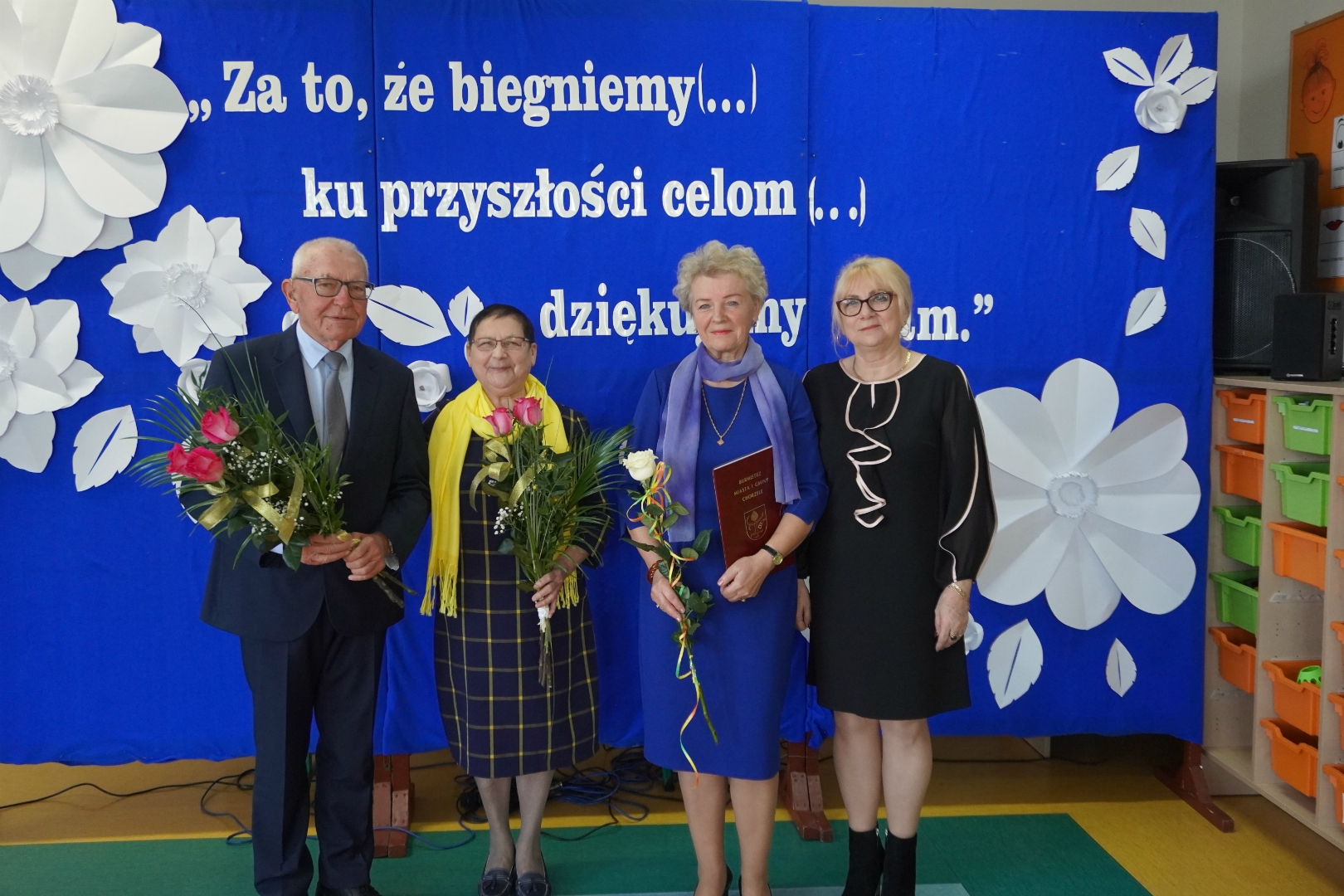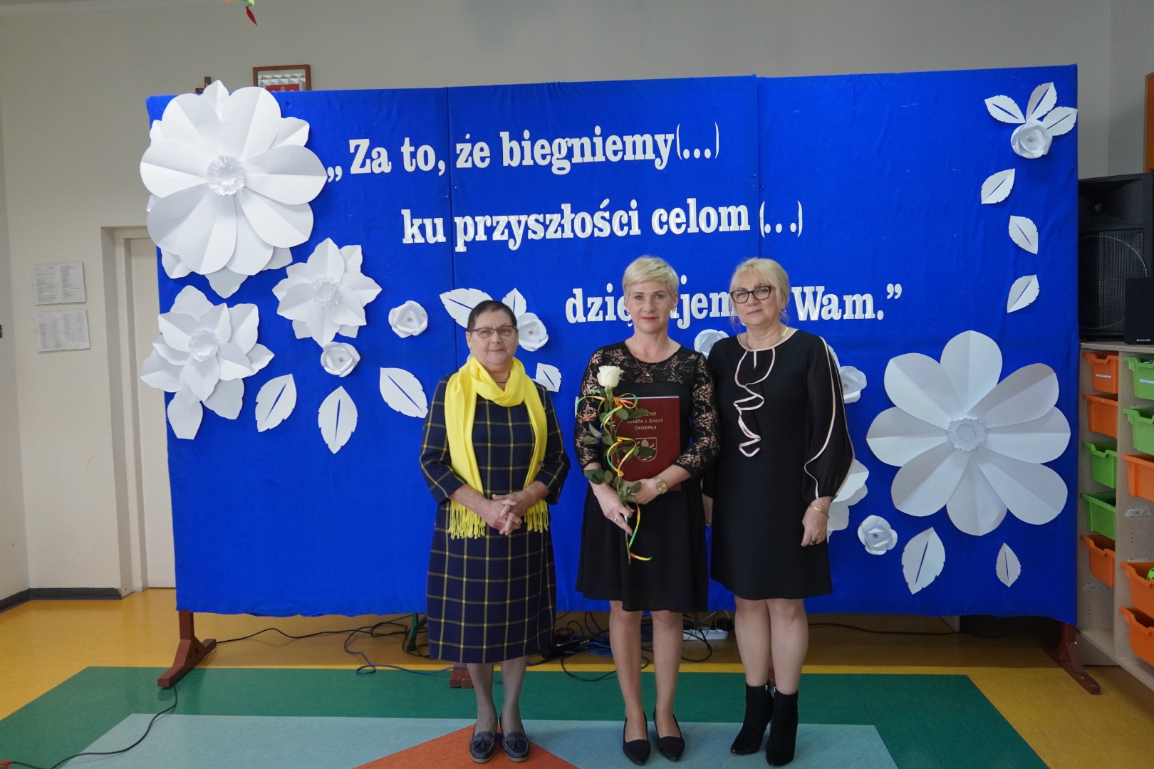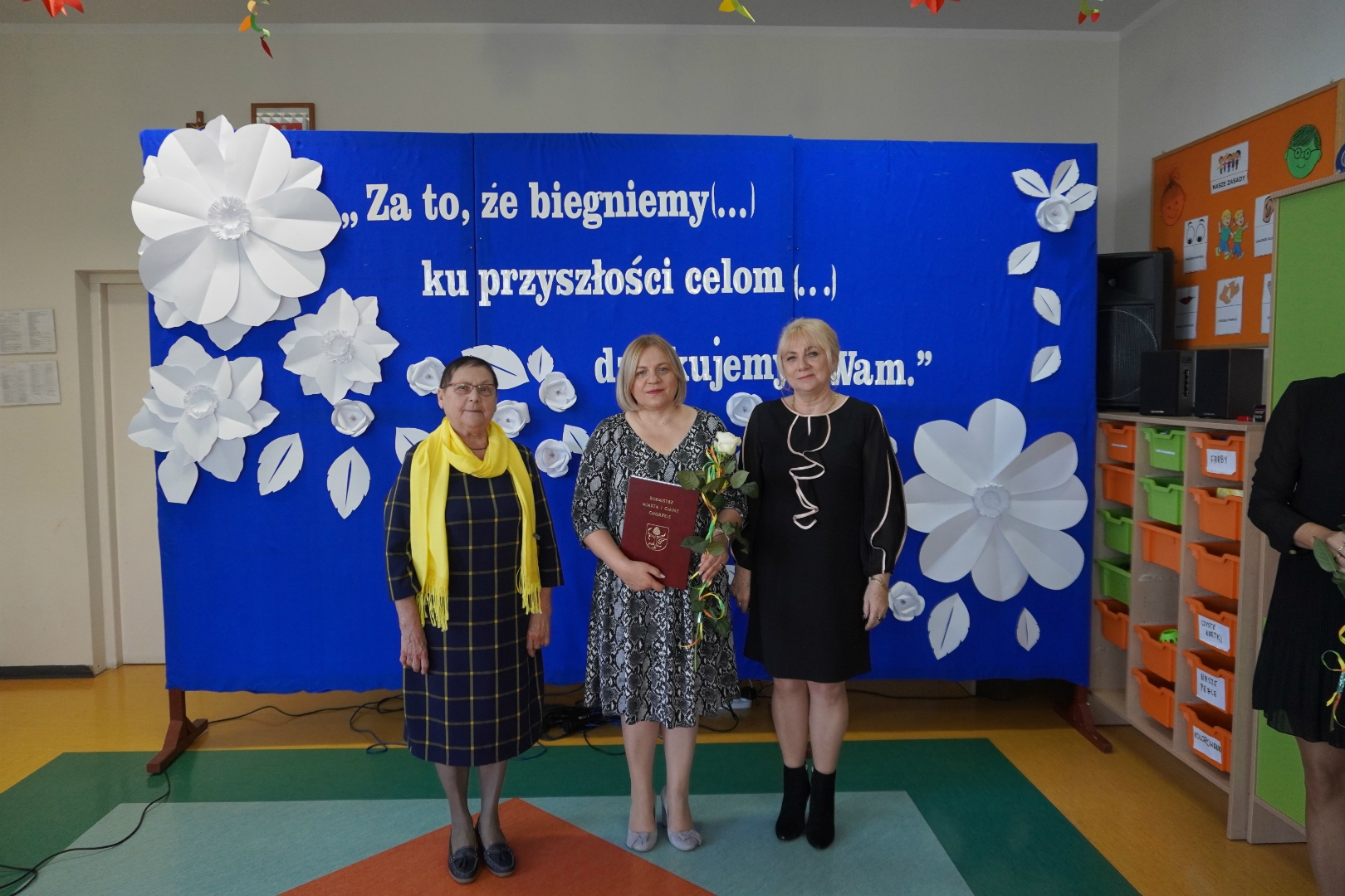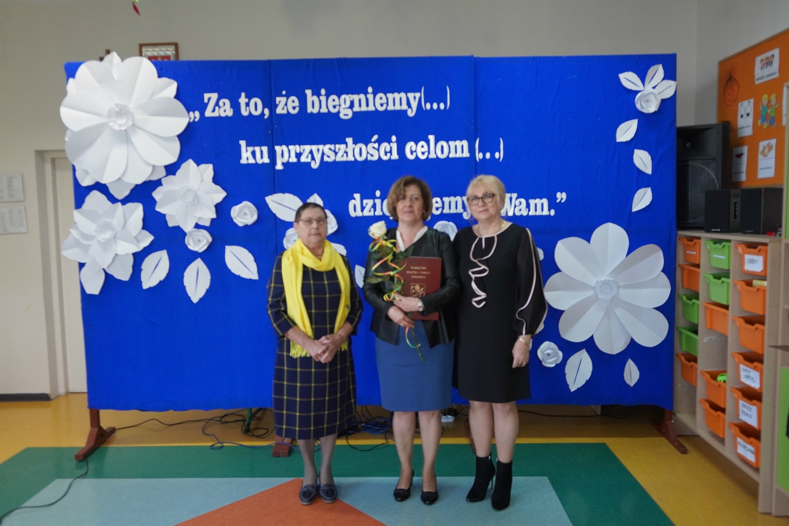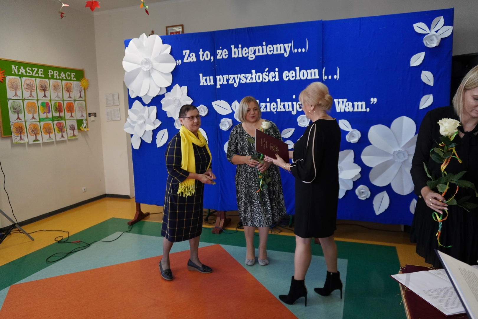 Burmistrz doceniła oraz wręczyła list gratulacyjny Kazimierze Kowalskiej -emerytowanej nauczycielce. Podziekowania otrzymała również Wanda Jastrzębska - radna Rady Miejskiej w Chorzelach oraz Ryszard Jastrzębski - Przewodniczący Ogniska Emerytów Związku Nauczycielstwa Polskiego w Chorzelach. Uroczystość poprowadziła Izabela Jurczewska, Dyrektor Wydziału Oświaty Miasta i Gminy Chorzele.